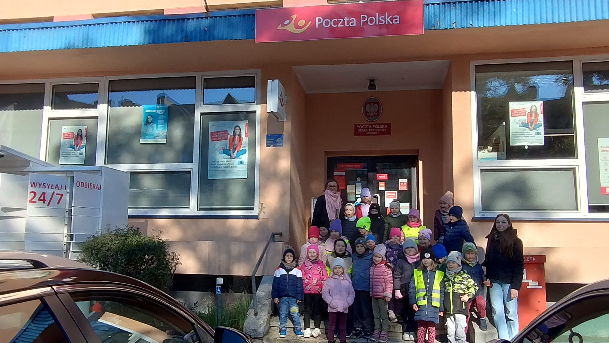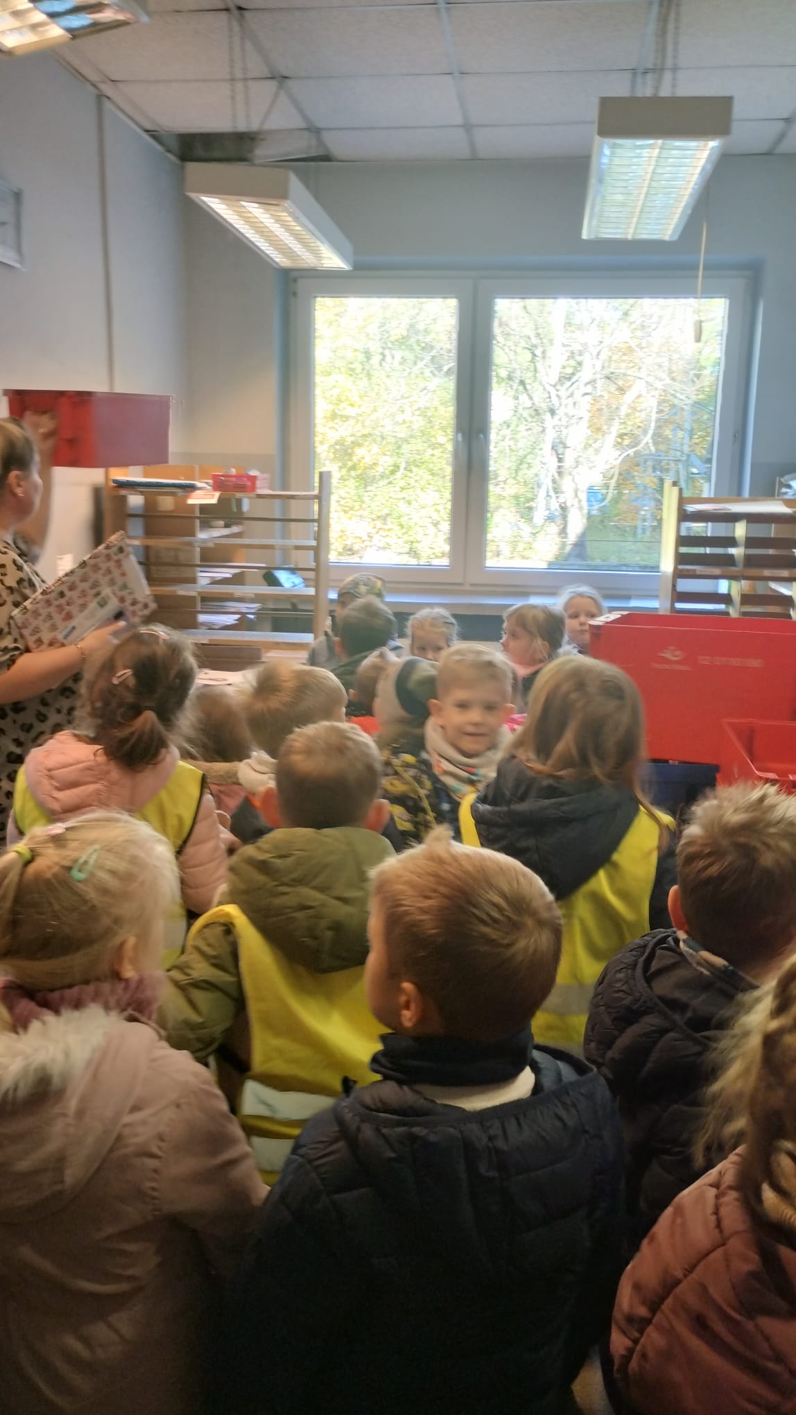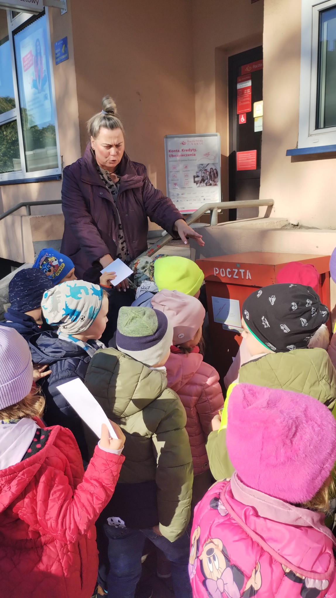 20.10.2025 r. dzieci z grupy „Mądre Sowy” z okazji Dnia Poczty Polskiej wybrały się na wycieczkę do Urzędu Poczty Polskiej w Lublińcu. Miały okazję przyjrzeć się z bliska pracy urzędników pocztowych oraz poznać zakres usług wykonywanych na poczcie. Bardzo serdecznie przywitały nas Panie, które troskliwie się nami zajęły. Najpierw opowiedziały historię poczty, jak wyglądało to kiedyś, a jak wygląda teraz. Następnie zwiedziliśmy hol poczty, a także stanowiska, przy których obsługuje się klientów.