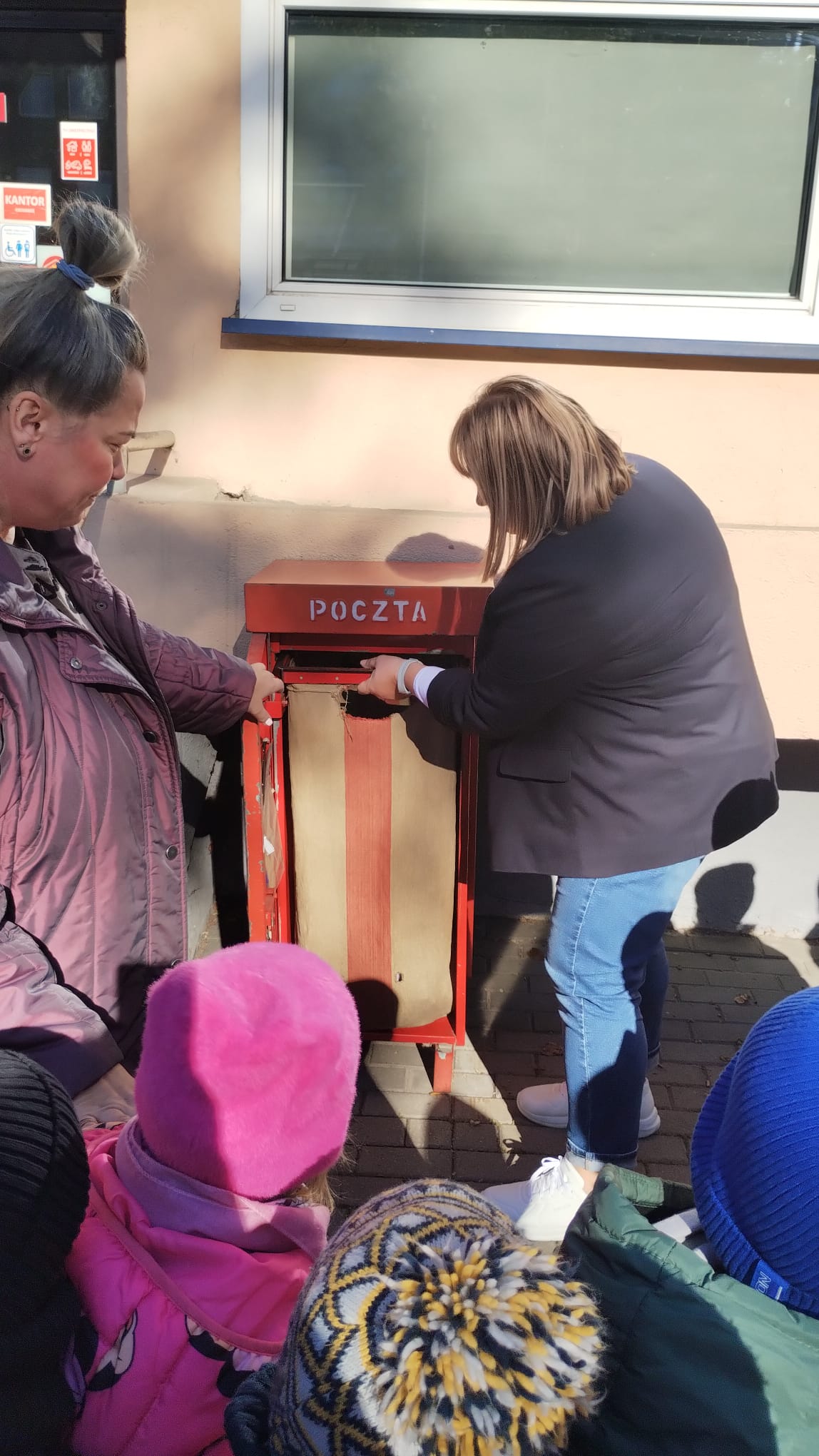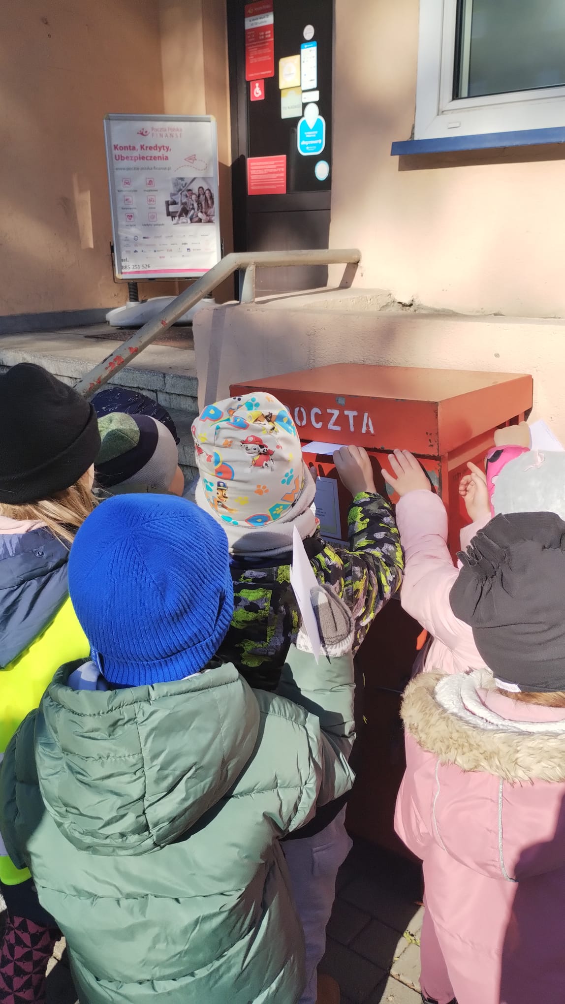Na koniec wizyty na poczcie zakupiliśmy znaczki, które dzieci przykleiły na swoje listy, a następnie wrzuciły do czerwonej skrzynki pocztowej.