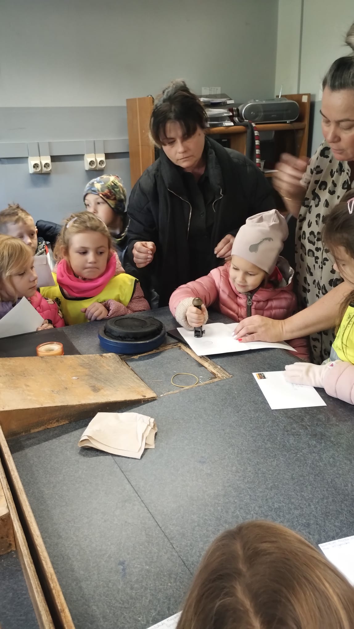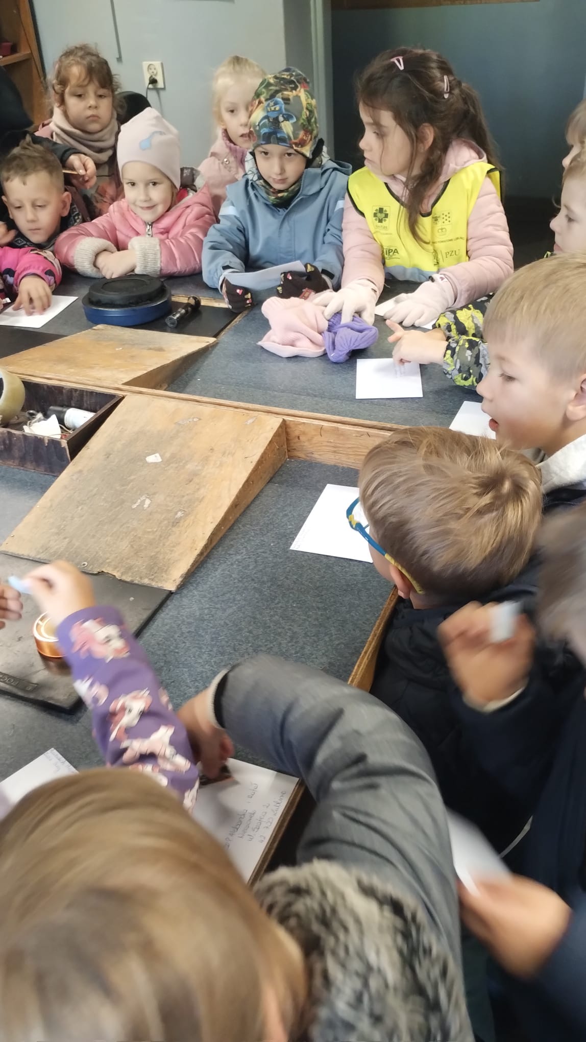 Pani pokazała nam duży stempel, był to datownik. Wykonaliśmy kilka stempli na kopertach. Następnie przedszkolaki zwiedziły inne pomieszczenia, m.in. sortownie. Dzieci poznały wyposażenie poczty, zwracały uwagę na skrzynki pocztowe, worki na listy i logo poczty.