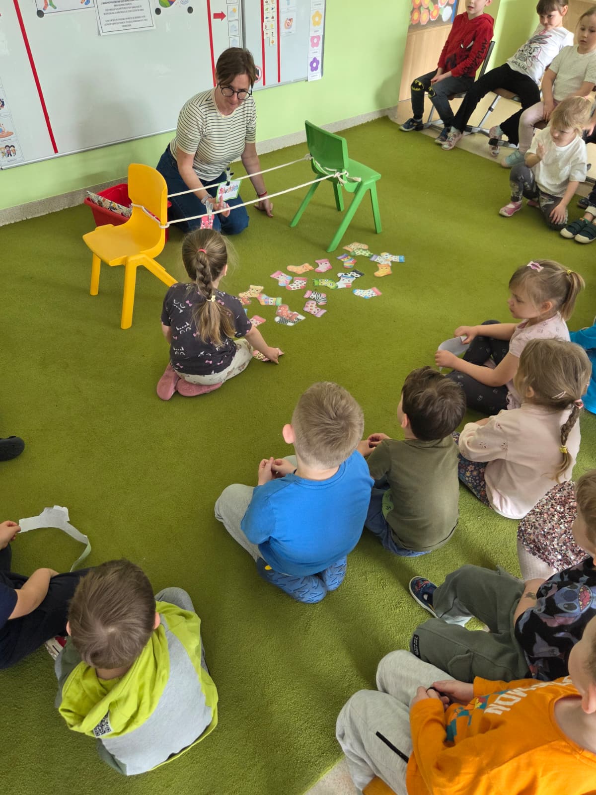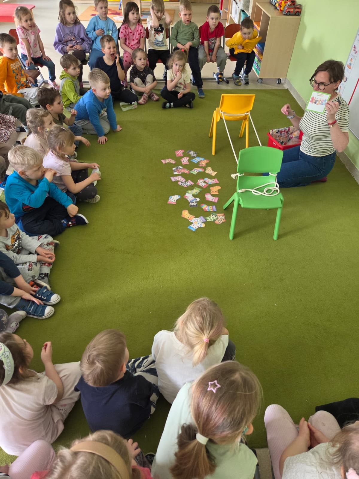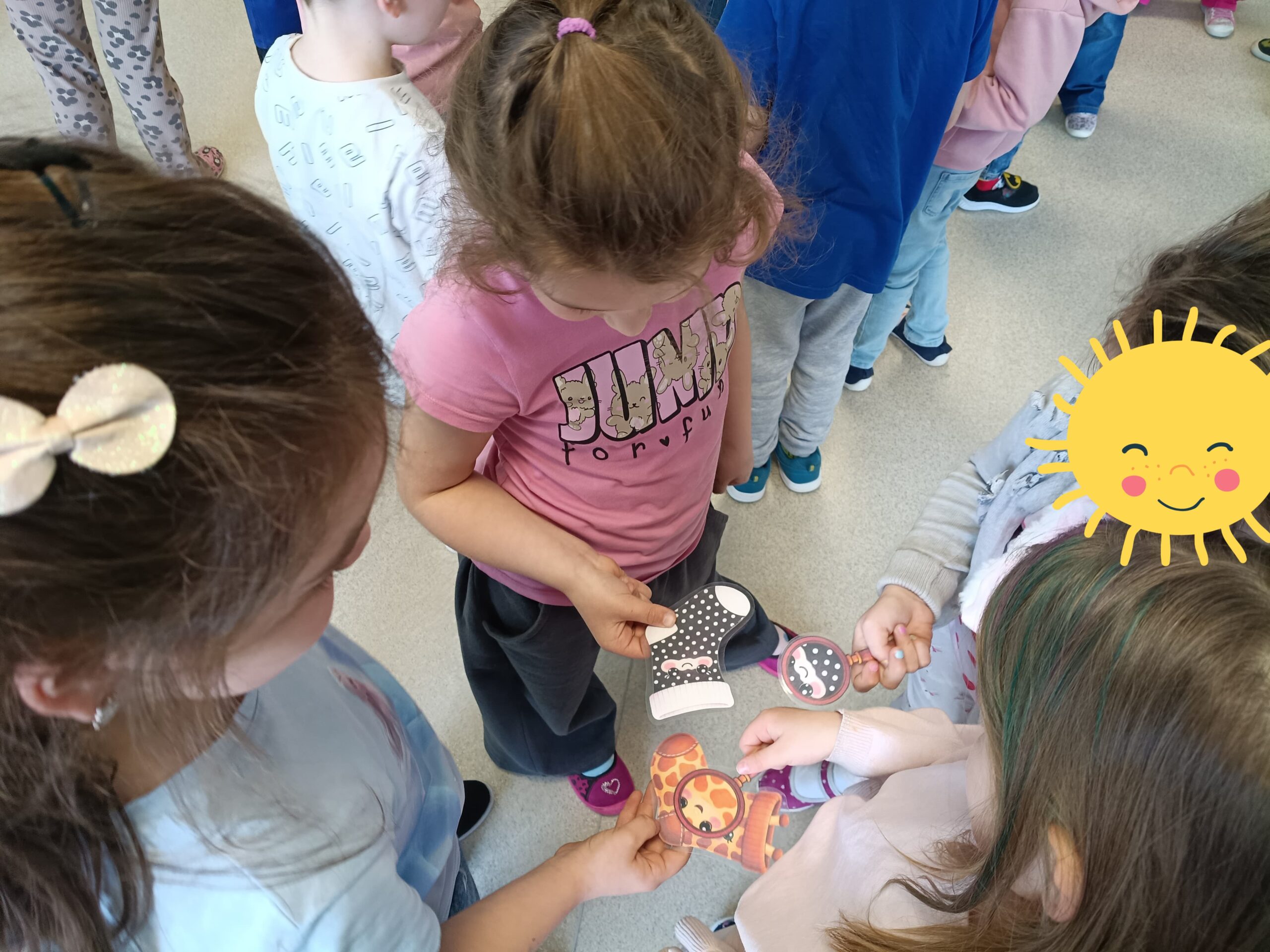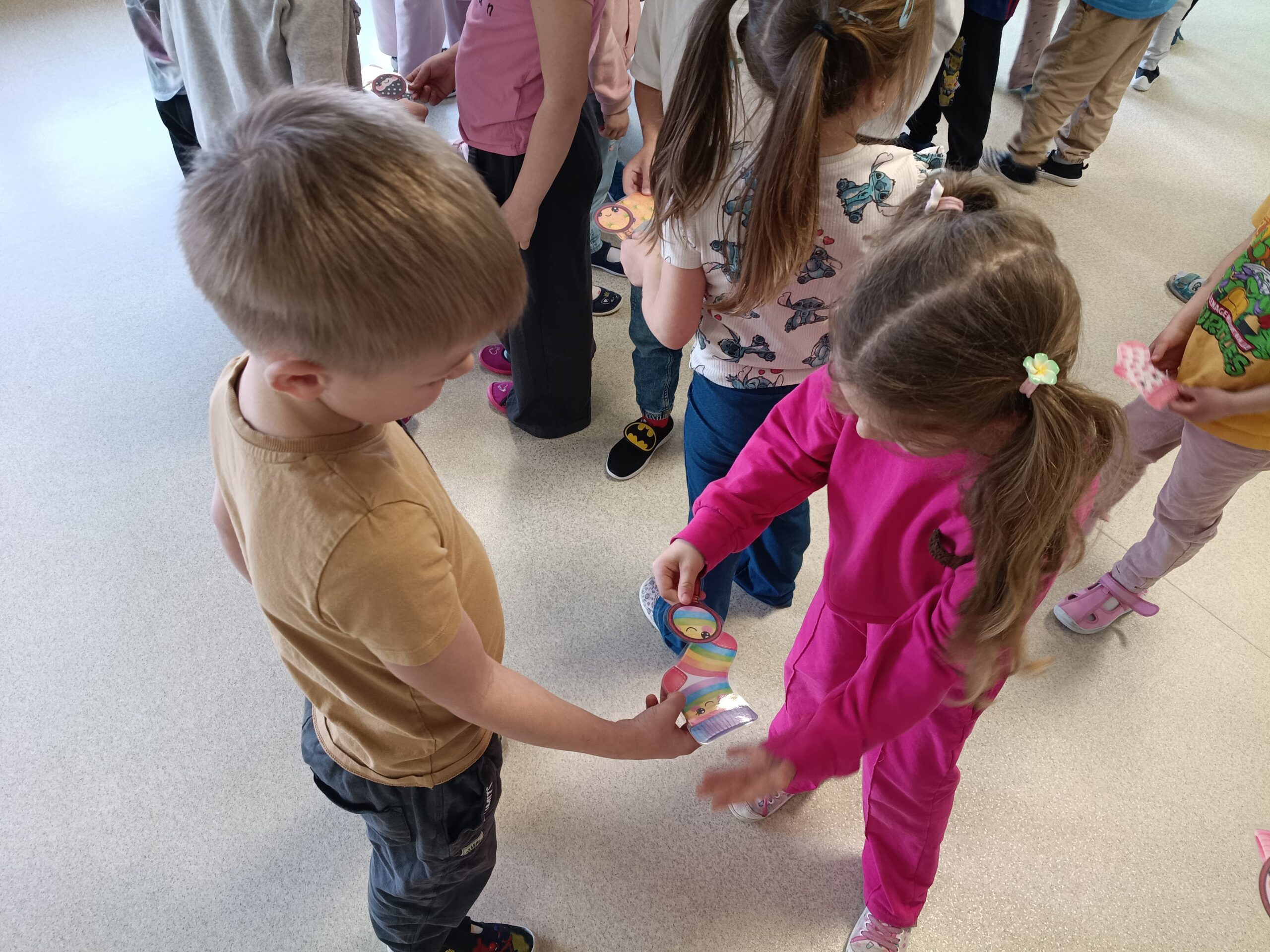 Dzieci oglądały i opowiadały o swoich kolorowych skarpetkach, uważnie wysłuchały co to jest za dzień i dlaczego jest obchodzony. Przedszkolaki wysłuchały bajki „Kolorowe skarpetki Janka” , bawiły się kolorami i skarpetkami dobierając je w pary i rozwieszając wg wzoru, a na koniec zajęć każdy ozdabiał skarpetkę wg własnego pomysłu.