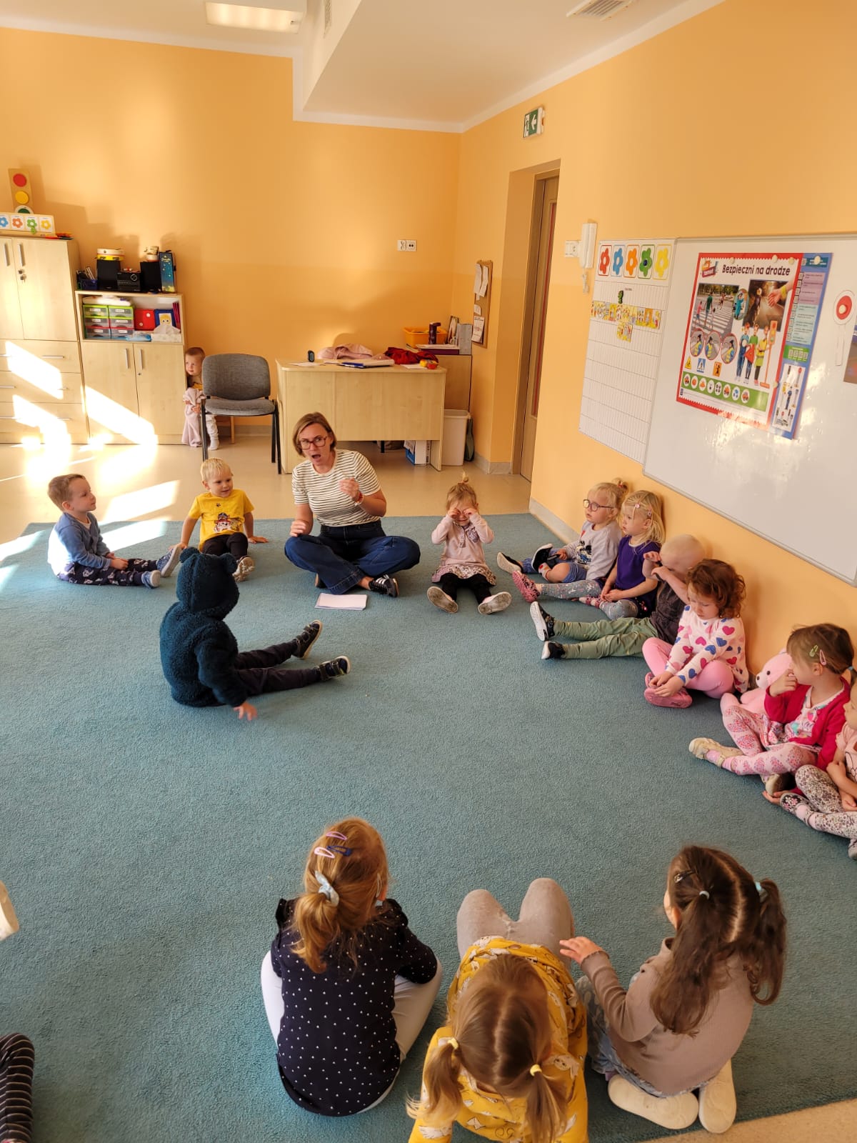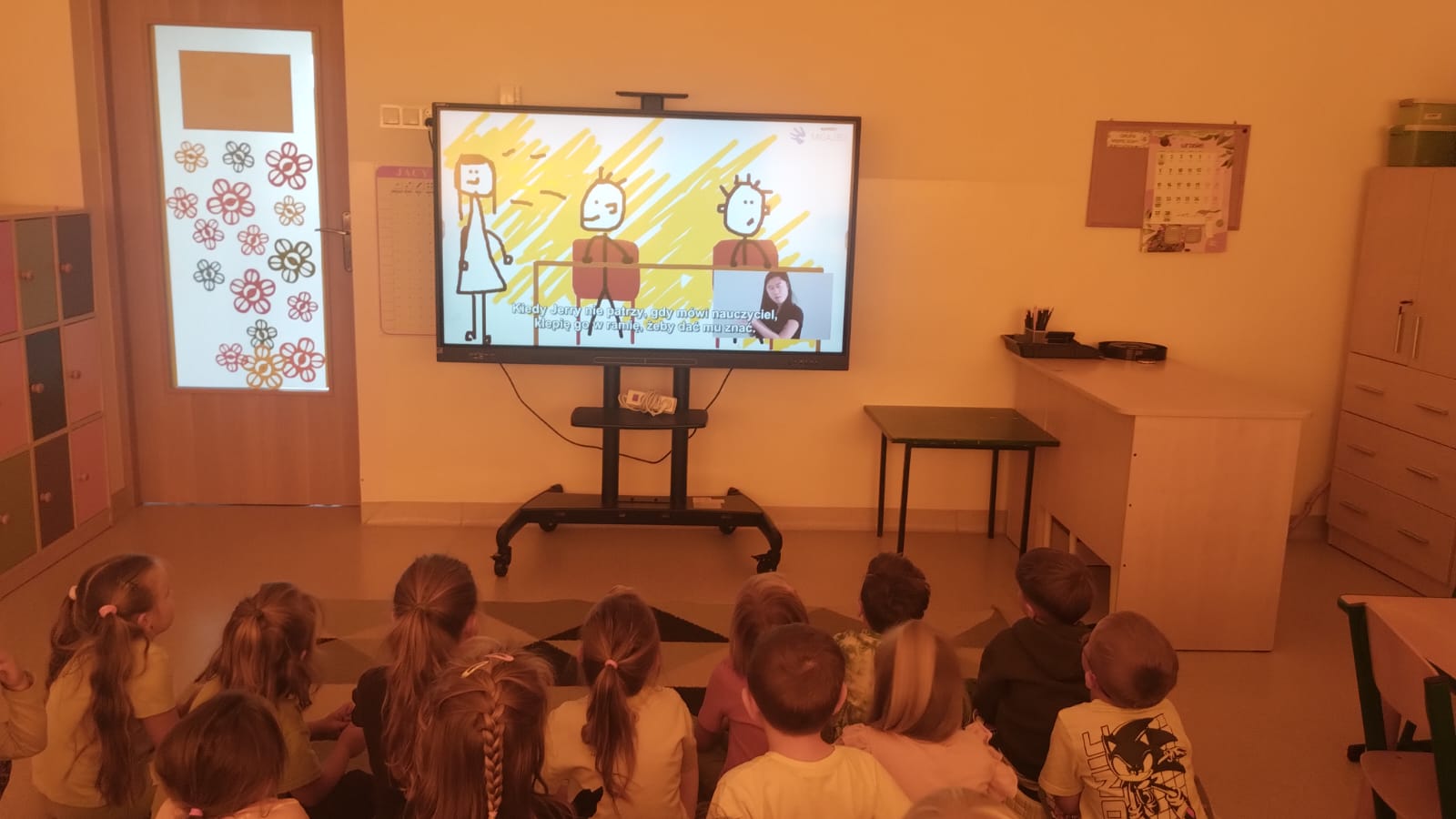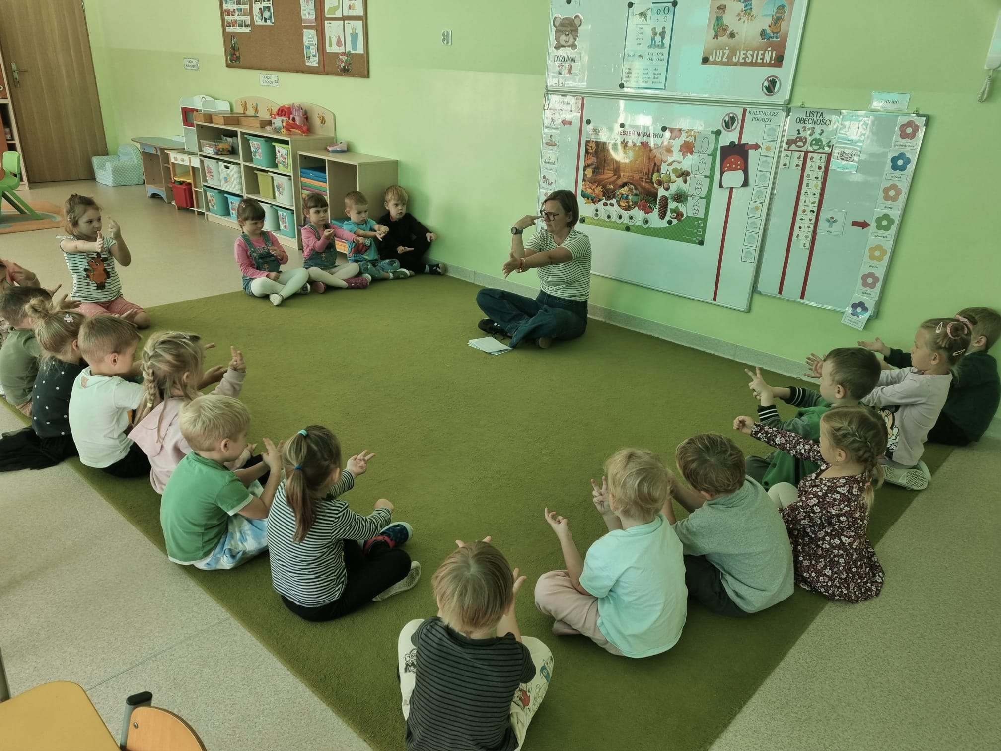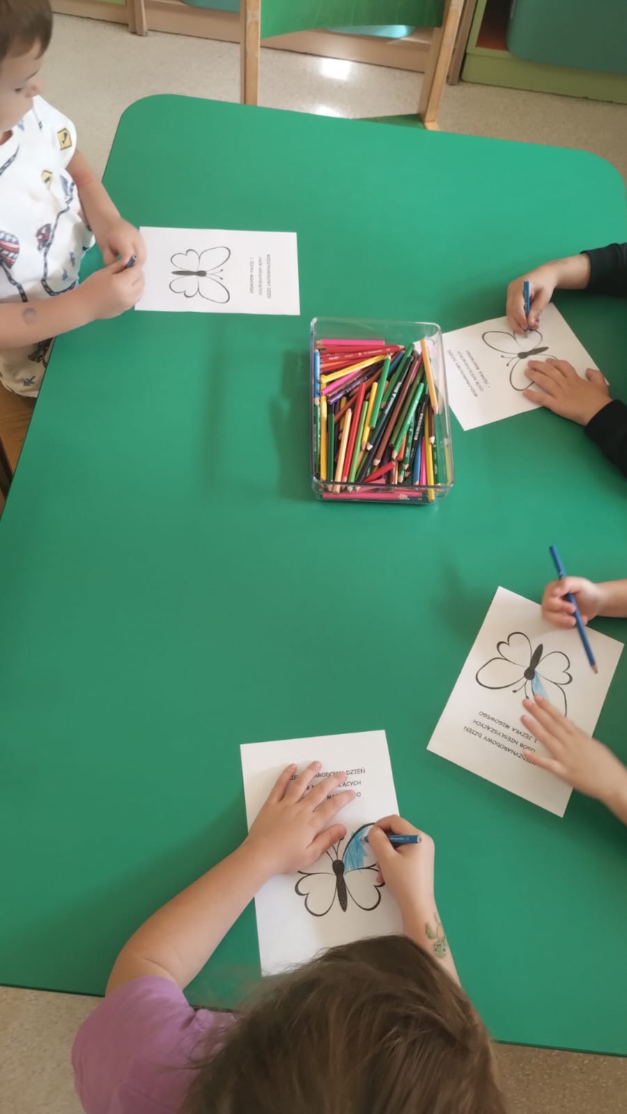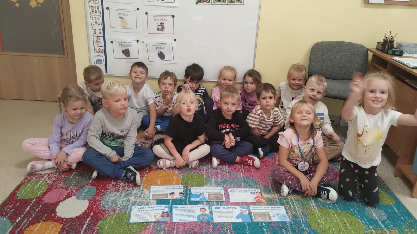 W naszym przedszkolu wspólnie świętowaliśmy Międzynarodowy Dzień Głuchych i języka migowego. Pani Karin przeprowadziła dla wszystkich grup zajęcia rozwijające u nich empatię, zrozumienie potrzeb człowieka głuchego, kształtujące otwartość i tolerancję. Naszym zadaniem jest nie tylko uczyć akceptacji, ale także wskazać alternatywny sposób komunikacji, przełamywać bariery językowe, poszerzać pogląd dziecka na świat i sposób porozumiewania się. Należy podkreślić, że prowadzenie zajęcia z wykorzystaniem elementów języka migowego jest także świetną zabawą. Posługiwanie się znakami daktylograficznymi i ideograficznymi języka migowego sprawiają, że dzieci nieświadomie usprawniają m.in. motorykę małą, koordynację wzrokowo-ruchową, kształtują umiejętności wizualno –przestrzenne, kształtują świadomość schematu własnego ciała itp. Dzieci dowiedziały się, że symbolem osób głuchych jest motyl, najczęściej koloru niebieskiego, lub ew. w odcieniach turkusu, gdyż motyle są głuche. Skrzydła motyla natomiast symbolizują barwność i piękno, a trzepot skrzydeł odzwierciedla jego dynamikę i szybkość. Jest to ogólnie przyjęty, międzynarodowy znak Głuchych.