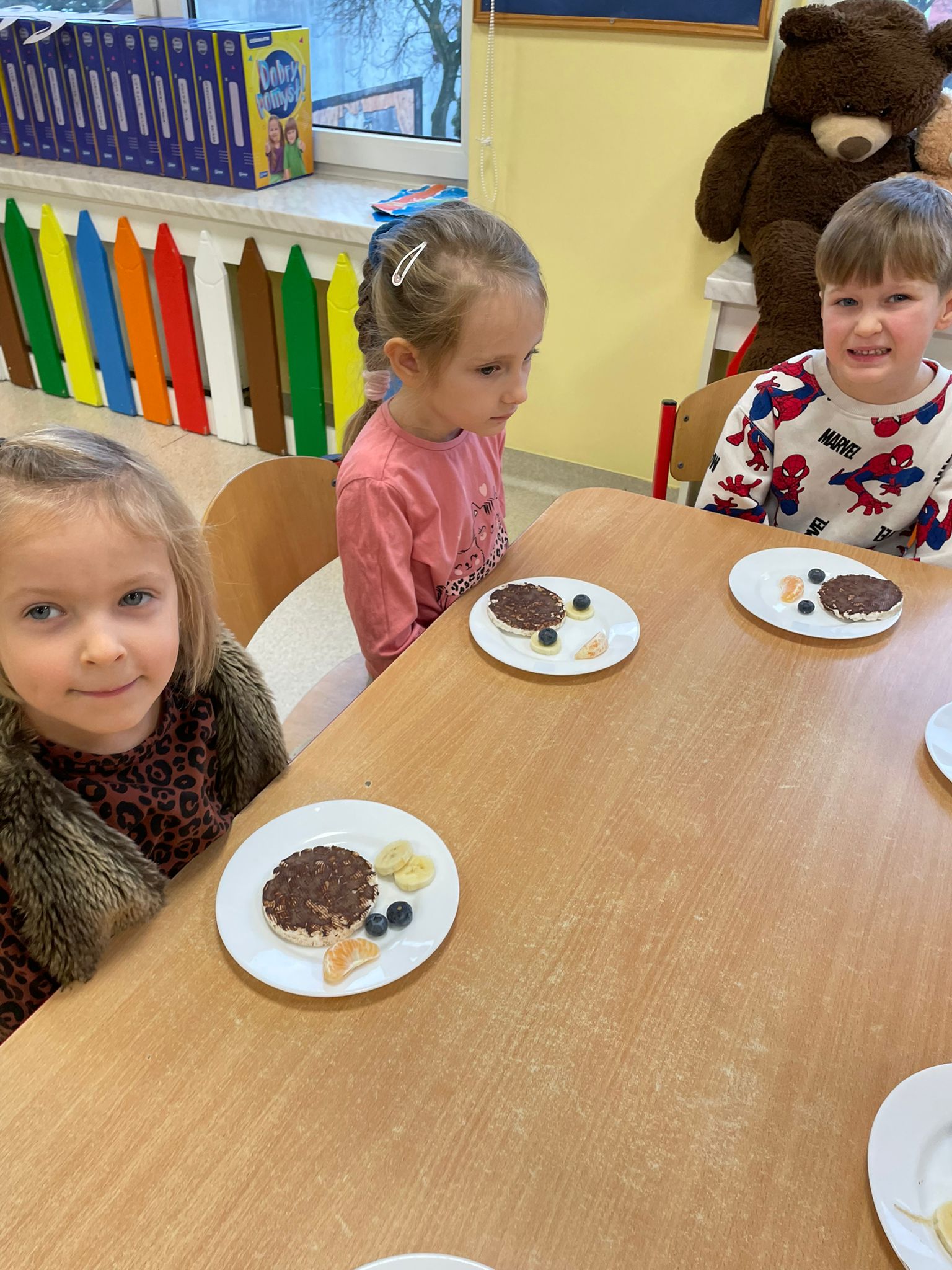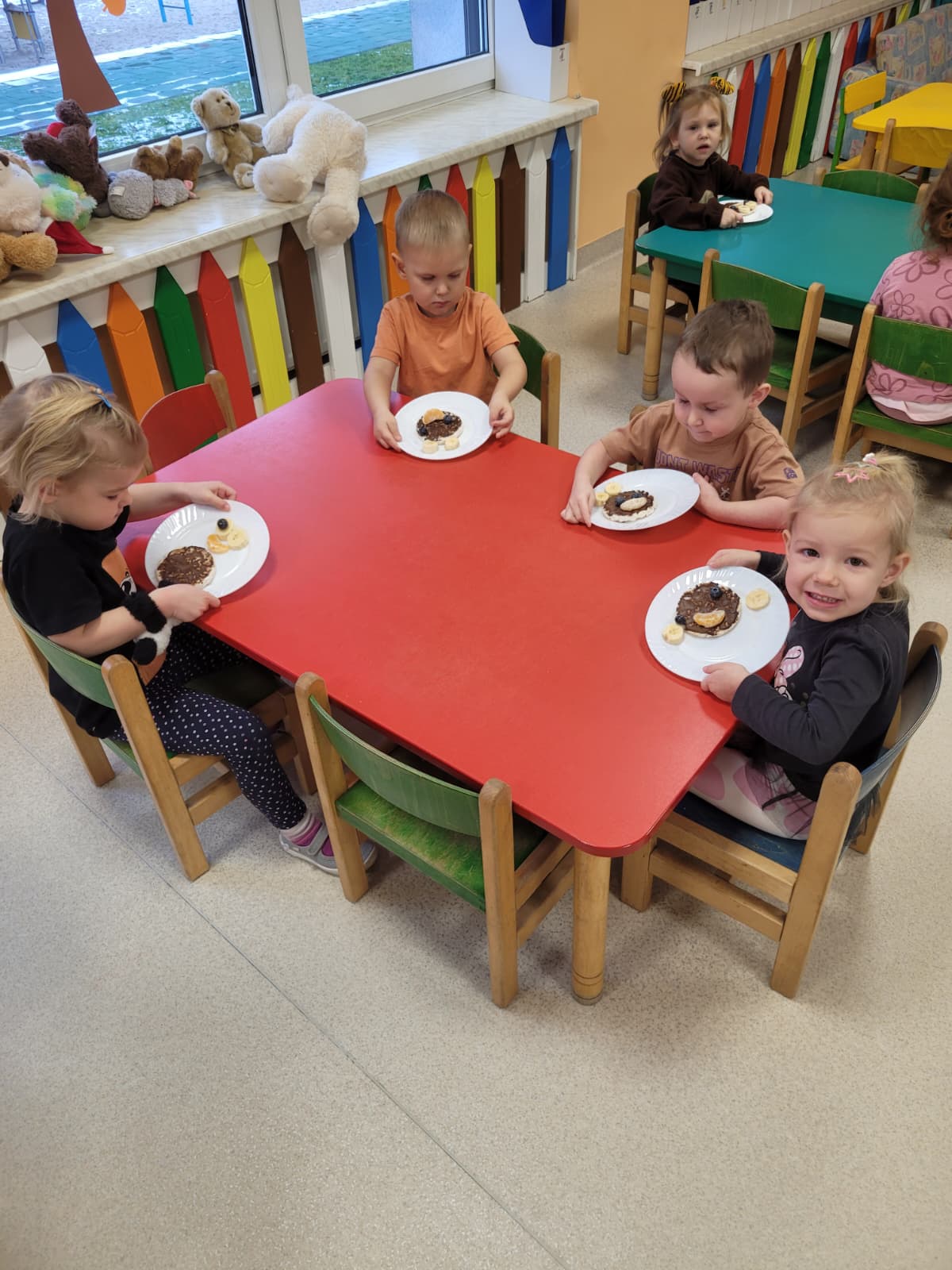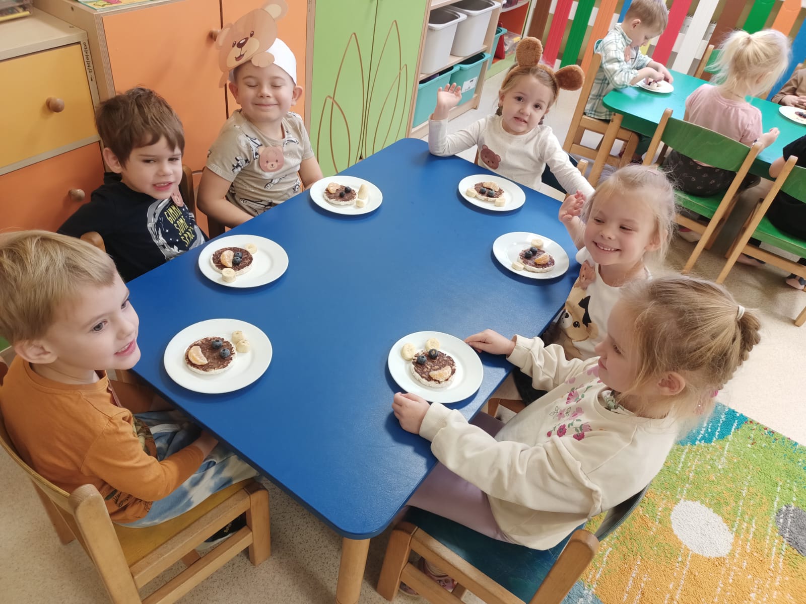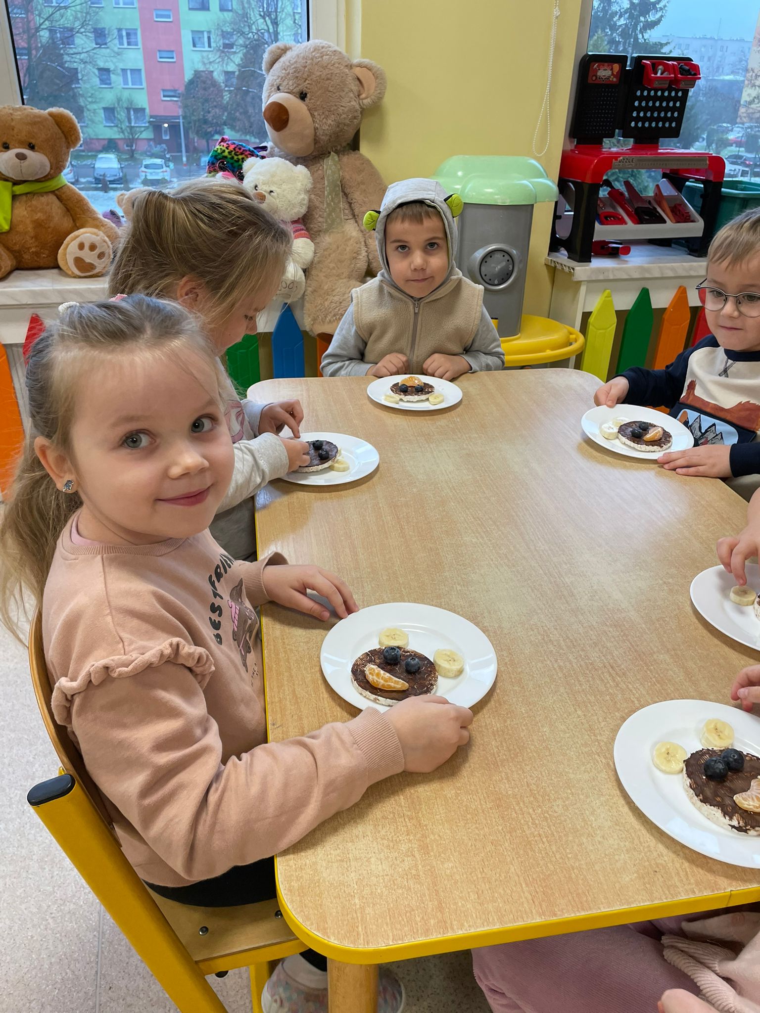 W rytmie piosenki wybrzmiało również „Sto lat” wszystkim „pluszakom”, bo to właśnie w tym dniu misie obchodzą swoje święto. Na zakończenie dzieci przygotowywały zdrową, misiową przekąskę, ozdabiając ją oczkami, uszkami i uśmiechem.