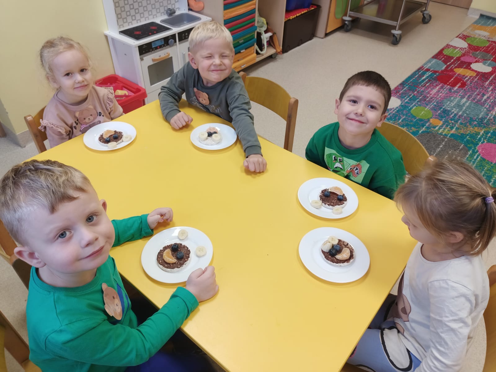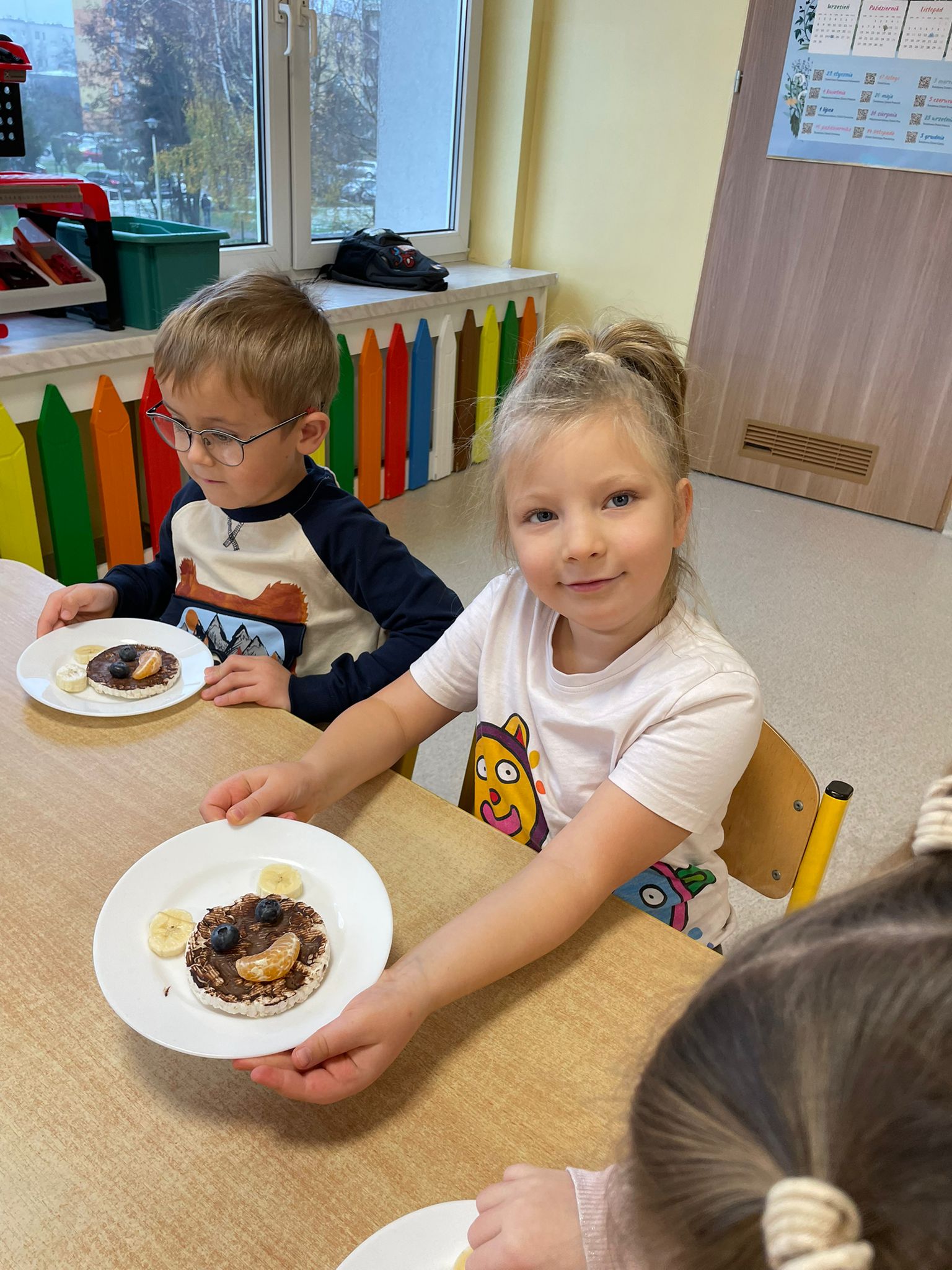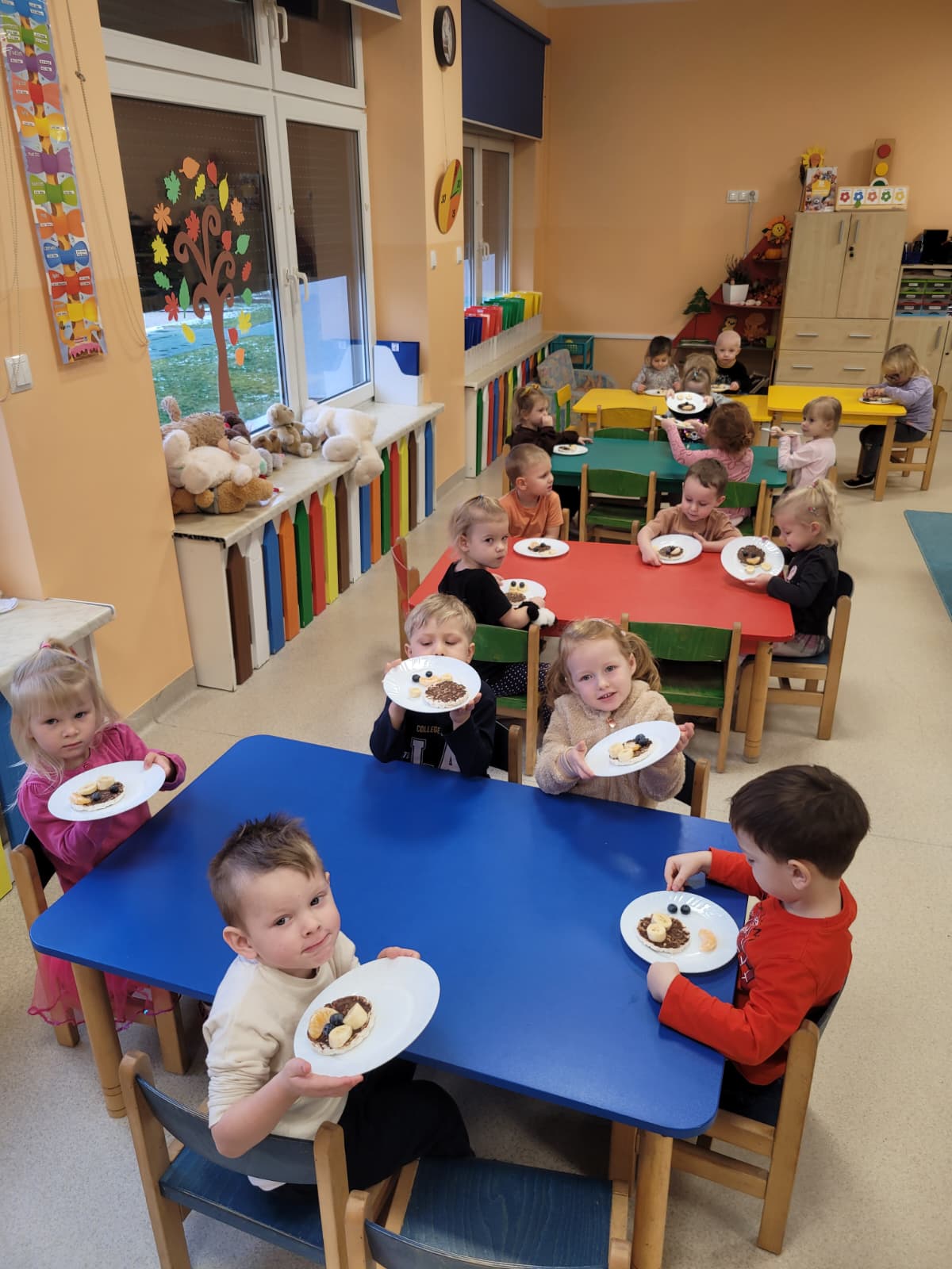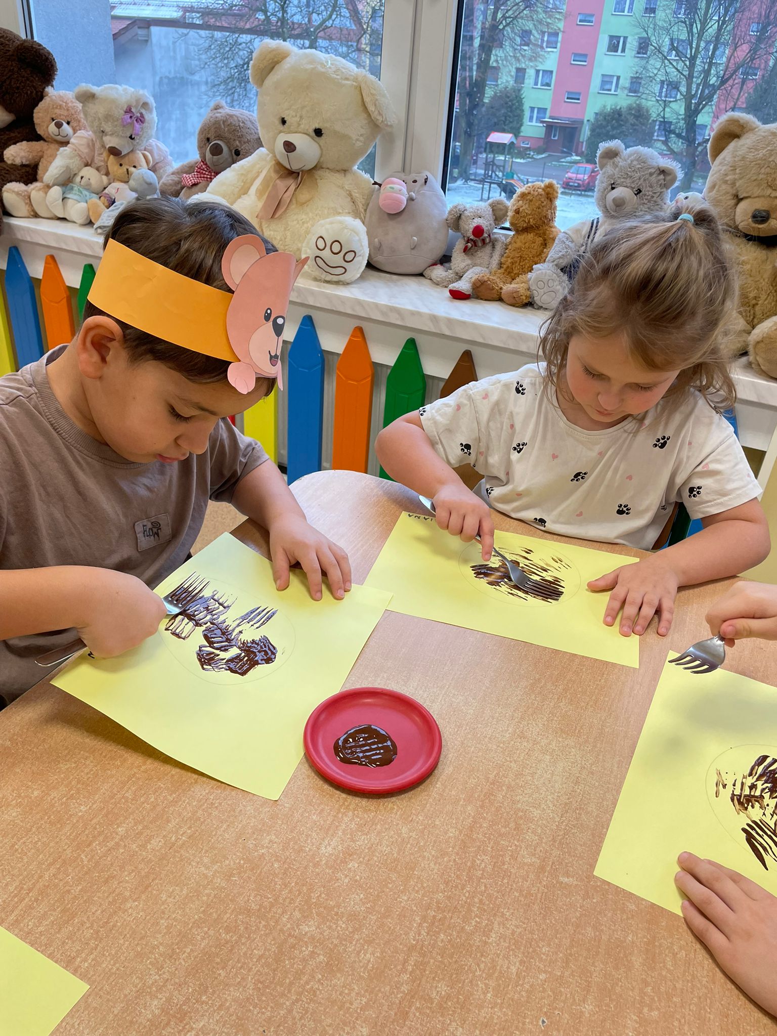 W rytmie piosenki wybrzmiało również „Sto lat” wszystkim „pluszakom”, bo to właśnie w tym dniu misie obchodzą swoje święto. Na zakończenie dzieci przygotowywały zdrową, misiową przekąskę, ozdabiając ją oczkami, uszkami i uśmiechem.