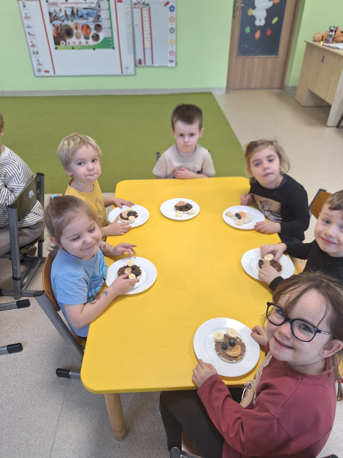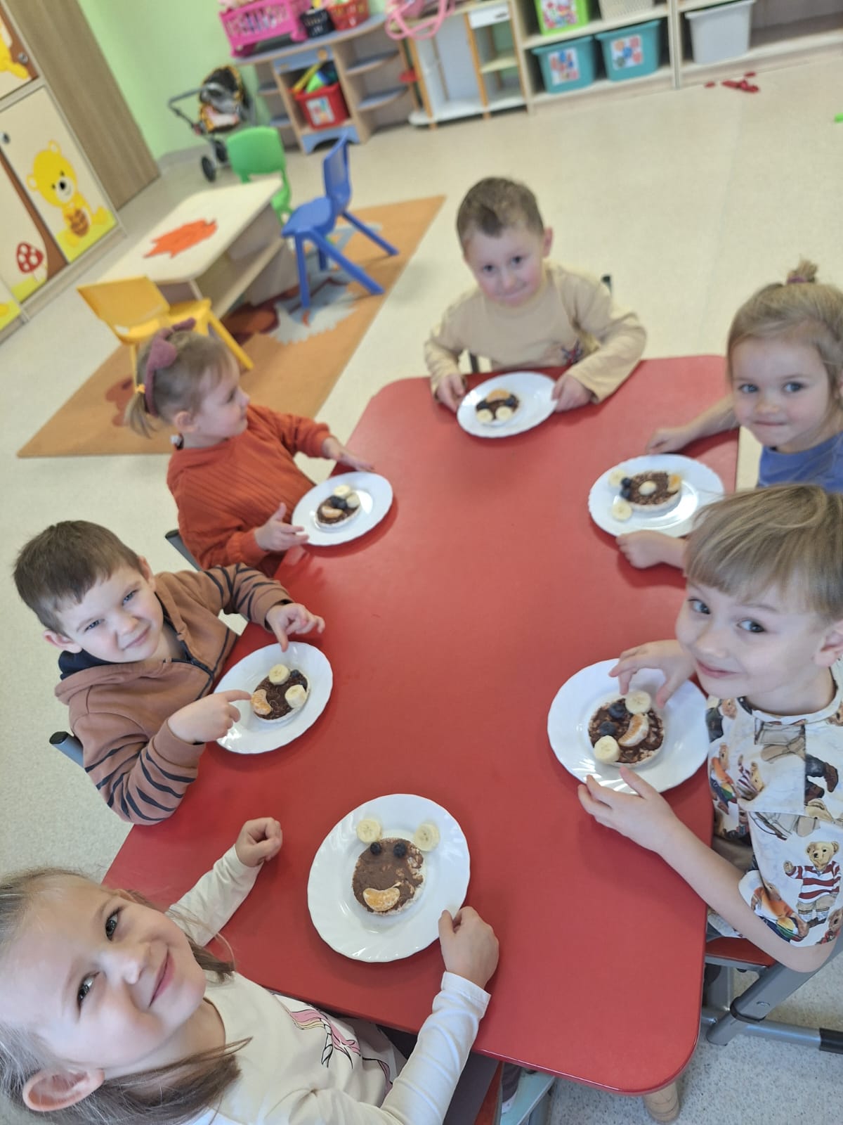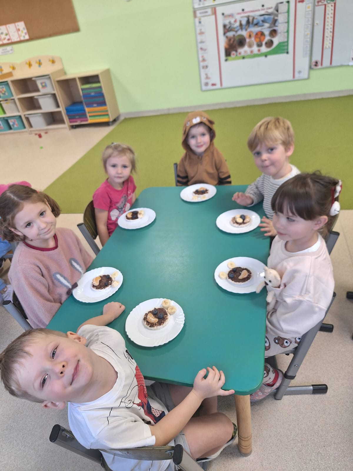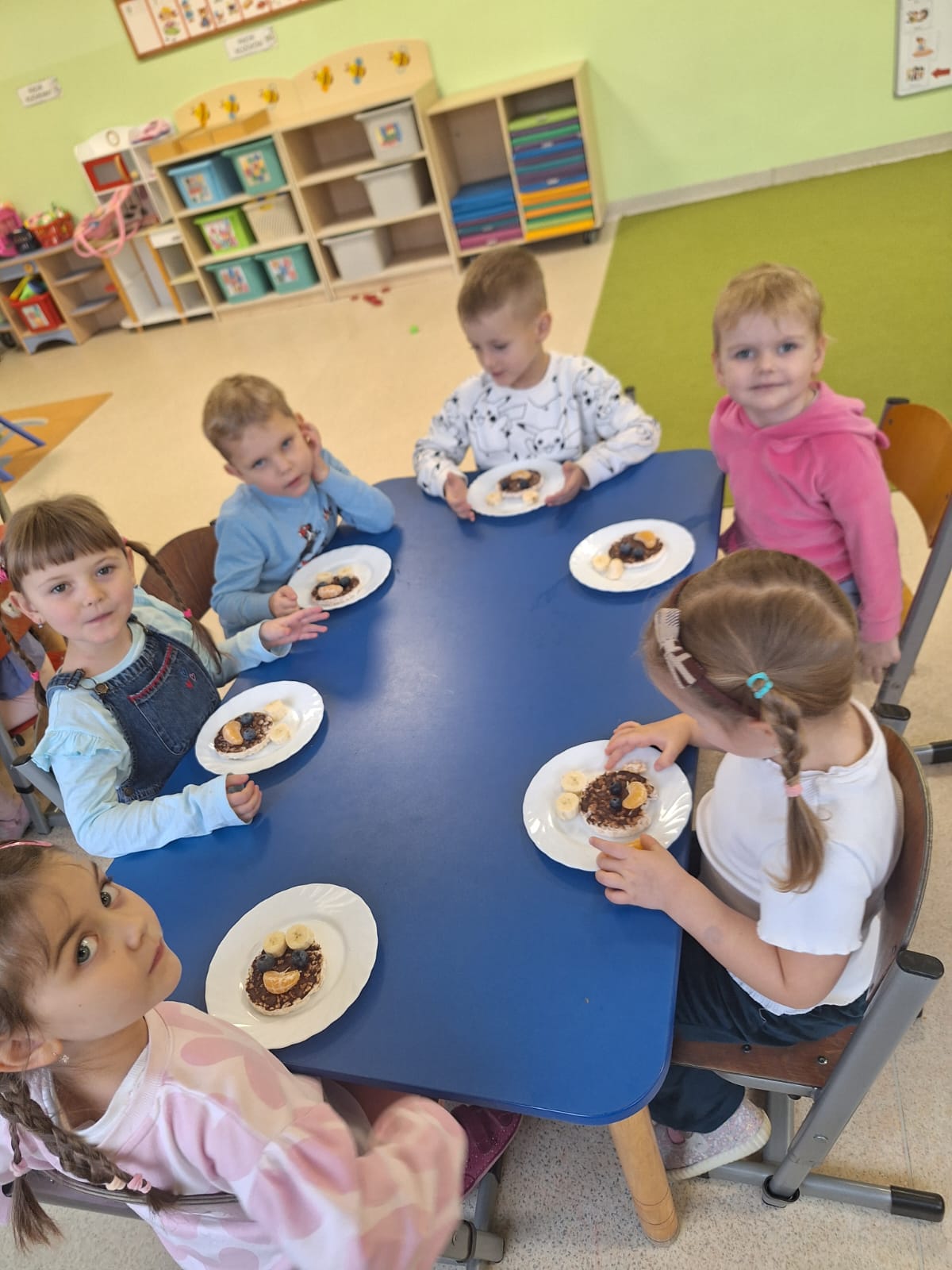 W rytmie piosenki wybrzmiało również „Sto lat” wszystkim „pluszakom”, bo to właśnie w tym dniu misie obchodzą swoje święto. Na zakończenie dzieci przygotowywały zdrową, misiową przekąskę, ozdabiając ją oczkami, uszkami i uśmiechem.