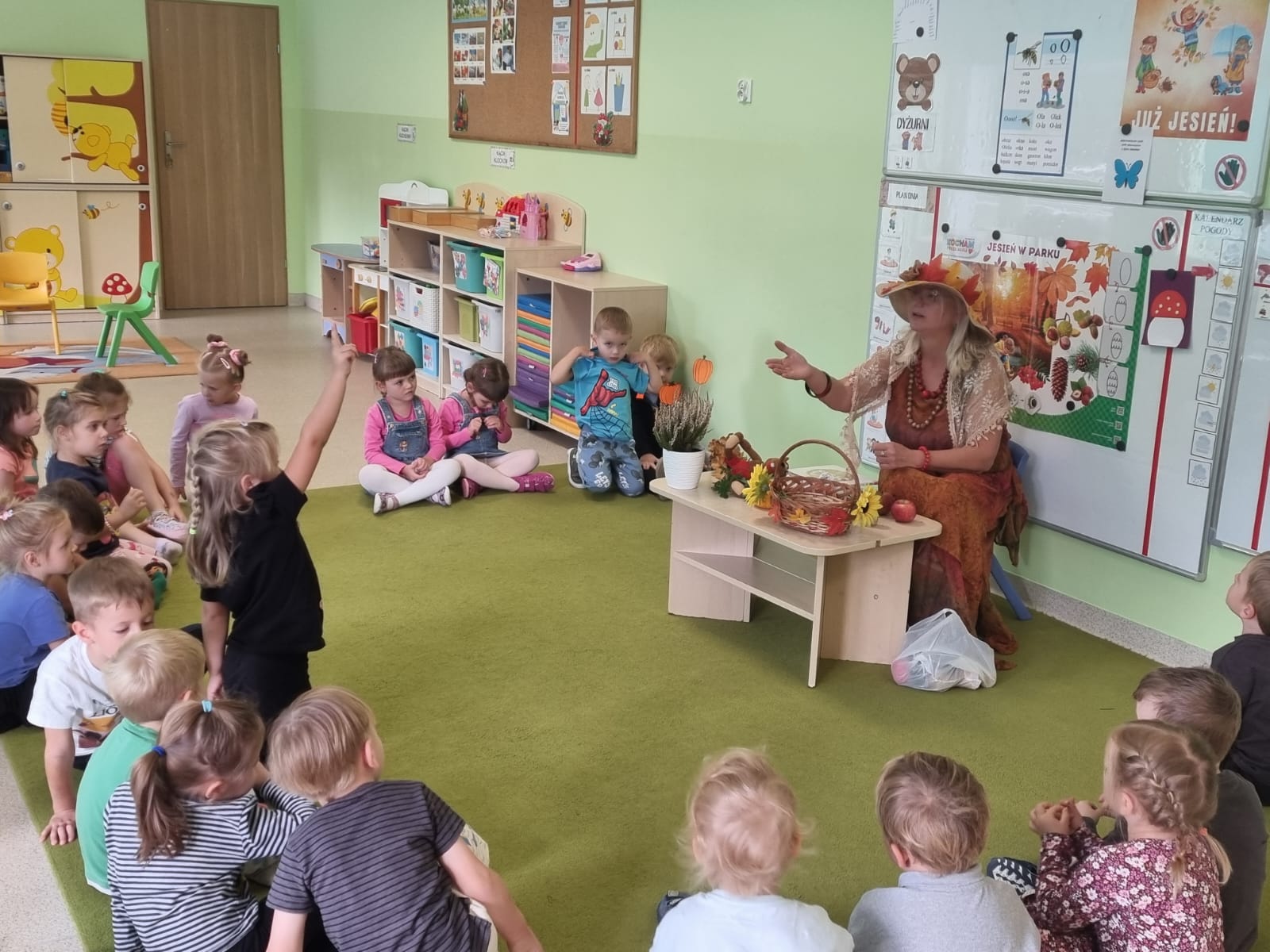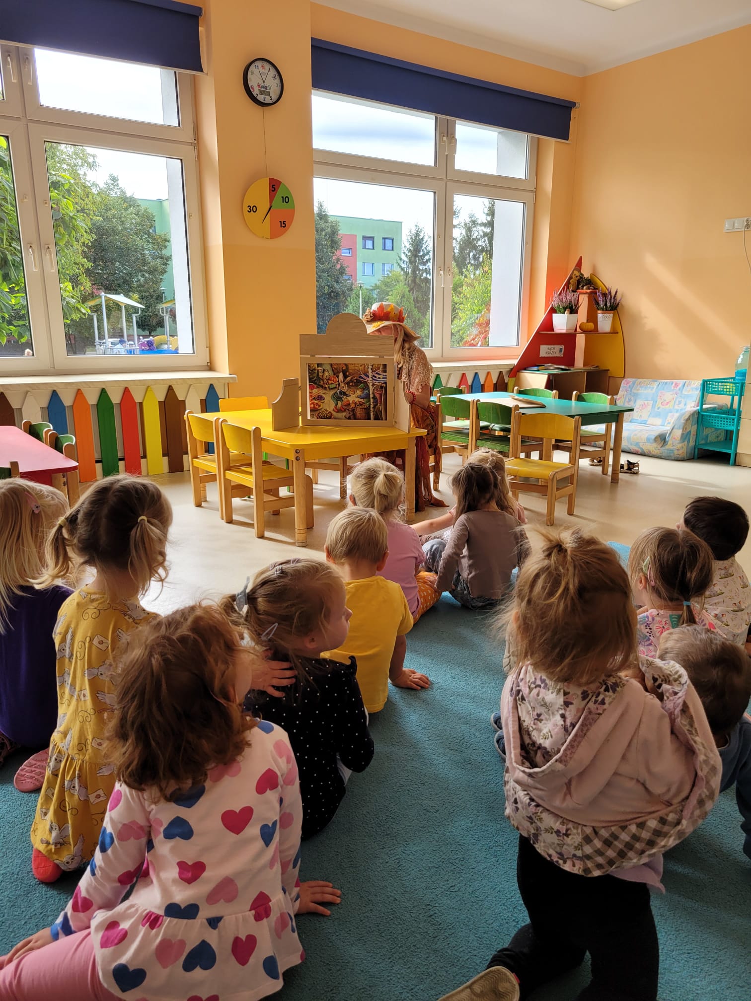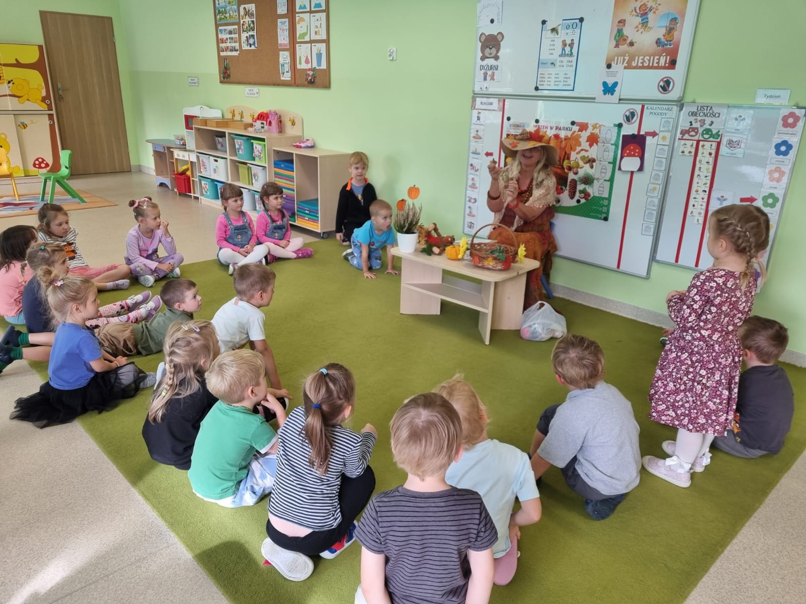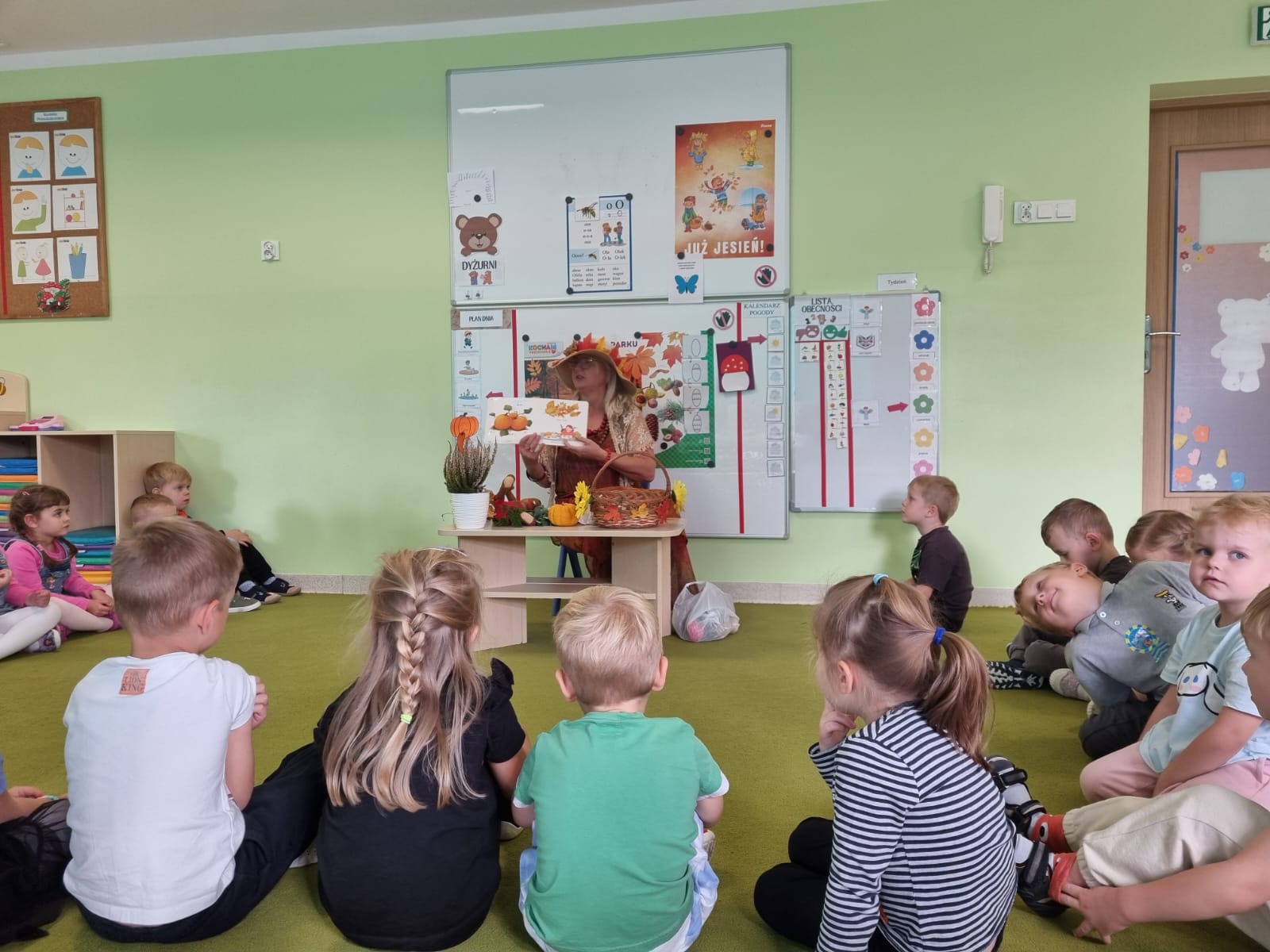 W naszym przedszkolu gościliśmy Panią Asię z biblioteki, która zaprosiła dzieci do wspólnego powitania Pani Jesieni. Przedszkolaki rozmawiały o oznakach nowej pory roku, poznały jesienne dary, a na zakończenie z zaciekawieniem obejrzały teatrzyk przygotowany specjalnie na tę okazję.