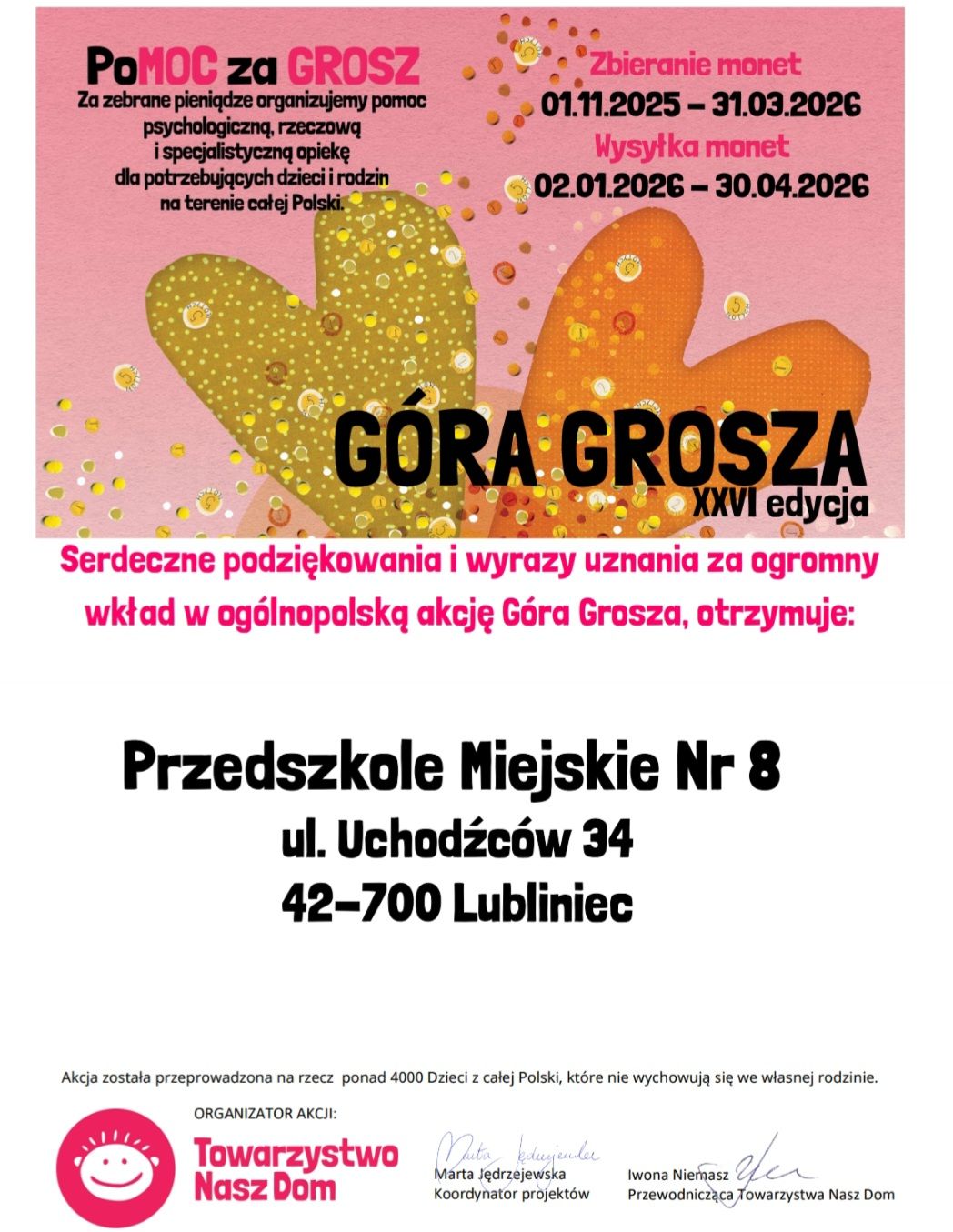 Otrzymaliśmy podziękowania za udział akcji Góra Grosza XXVI edycja. Jednocześnie składamy serdeczne podziękowania dla rodziców za ich wsparcie i zaangażowanie w tę inicjatywę.