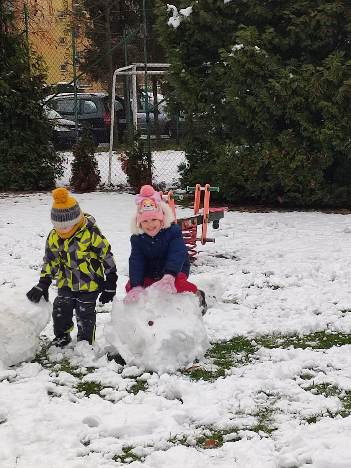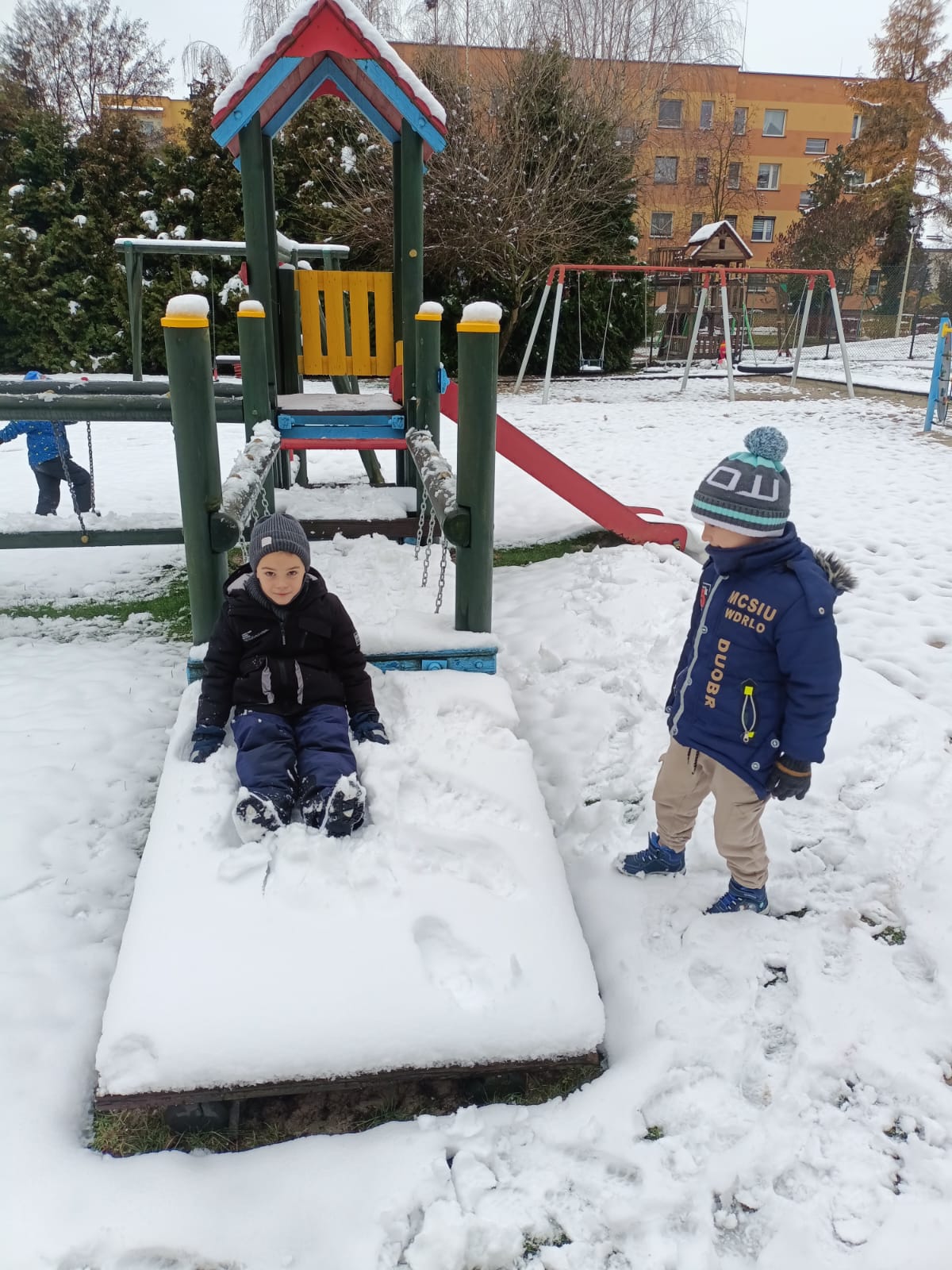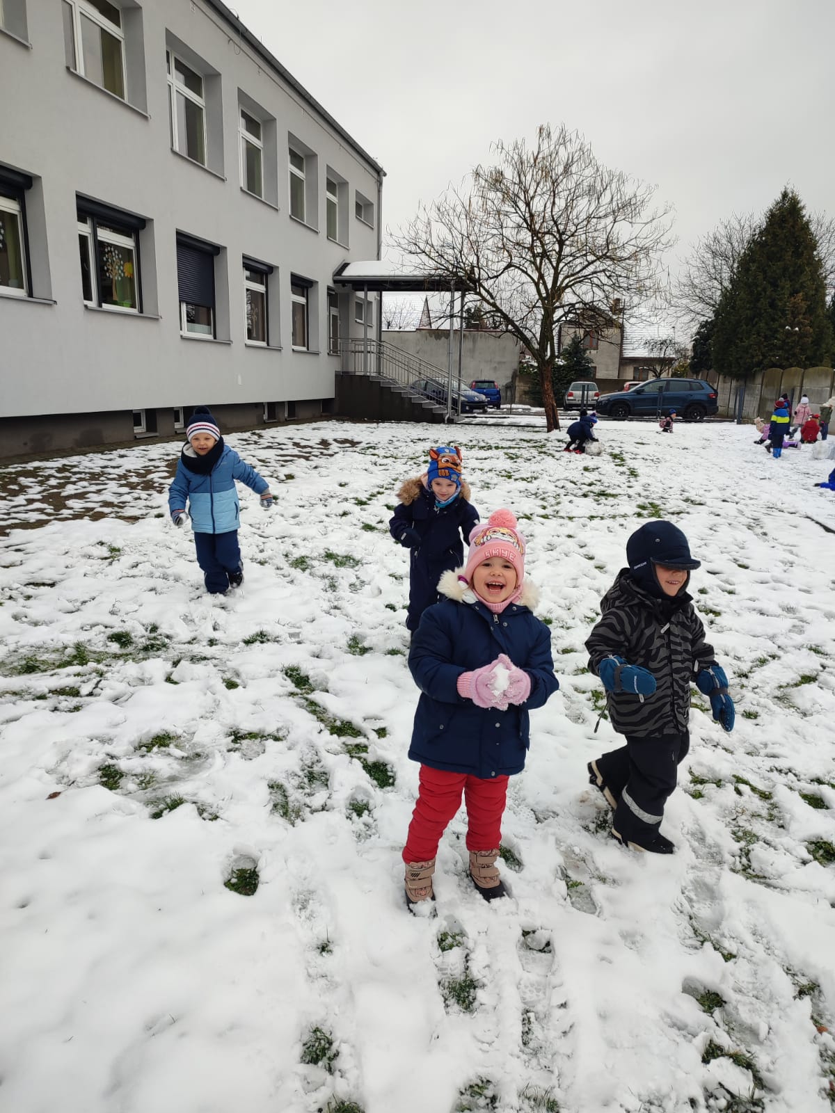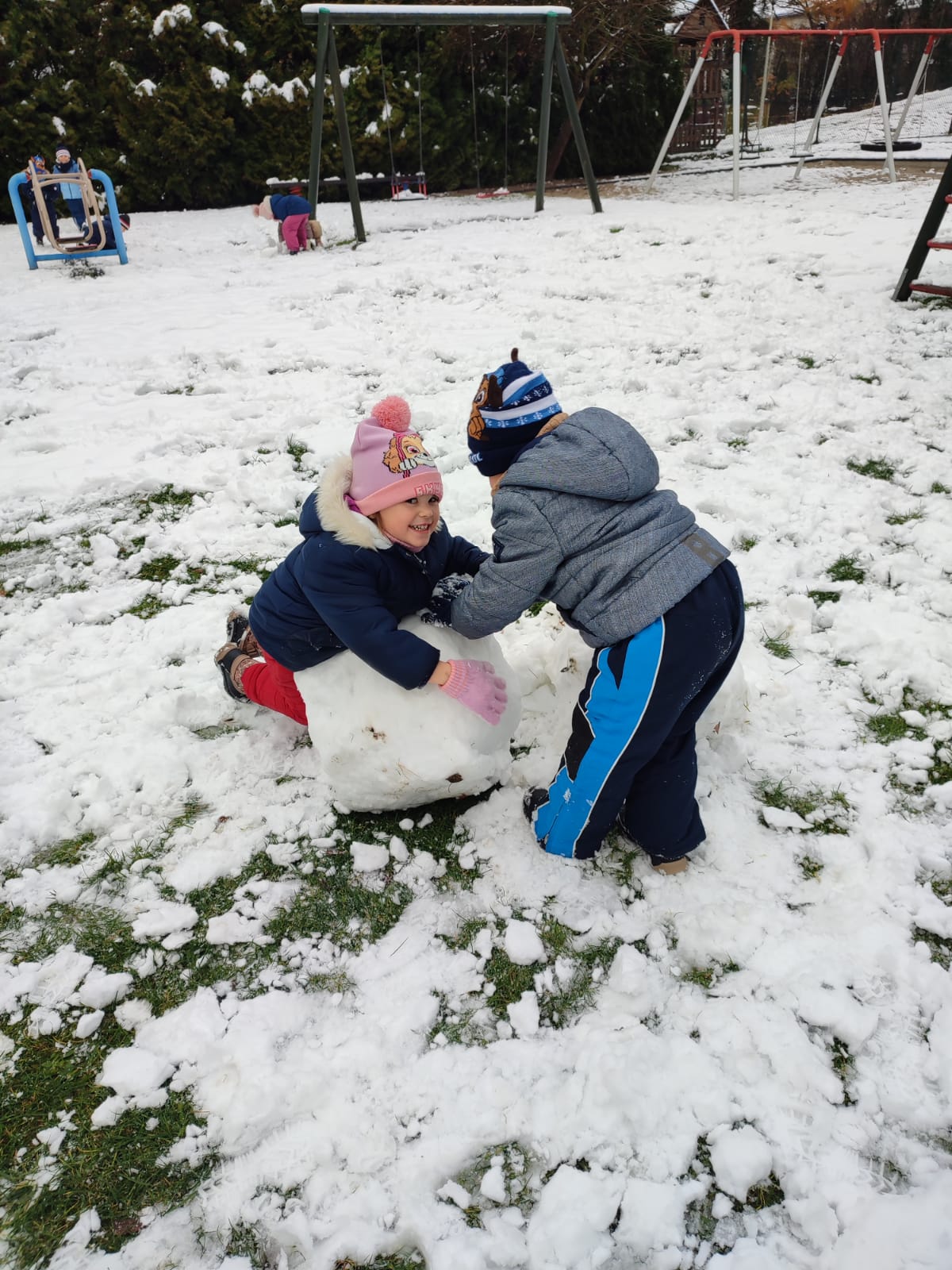 Dzieci z grup „Pszczółki” i „Słoneczka” z radością wyszły na przedszkolny plac zabaw, aby korzystać z uroków pierwszego śniegu. Maluchy z entuzjazmem biegały, lepiły małe bałwanki i obserwowały zimowe zmiany w otoczeniu. Pierwszy śnieg przyniósł im mnóstwo uśmiechu i świetnej zabawy na świeżym powietrzu.