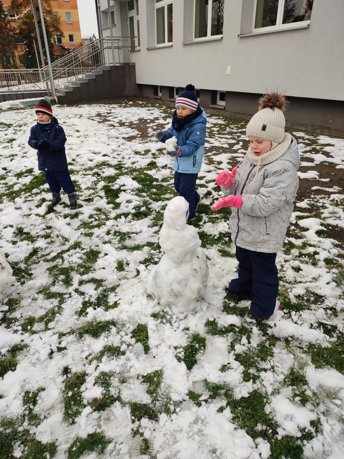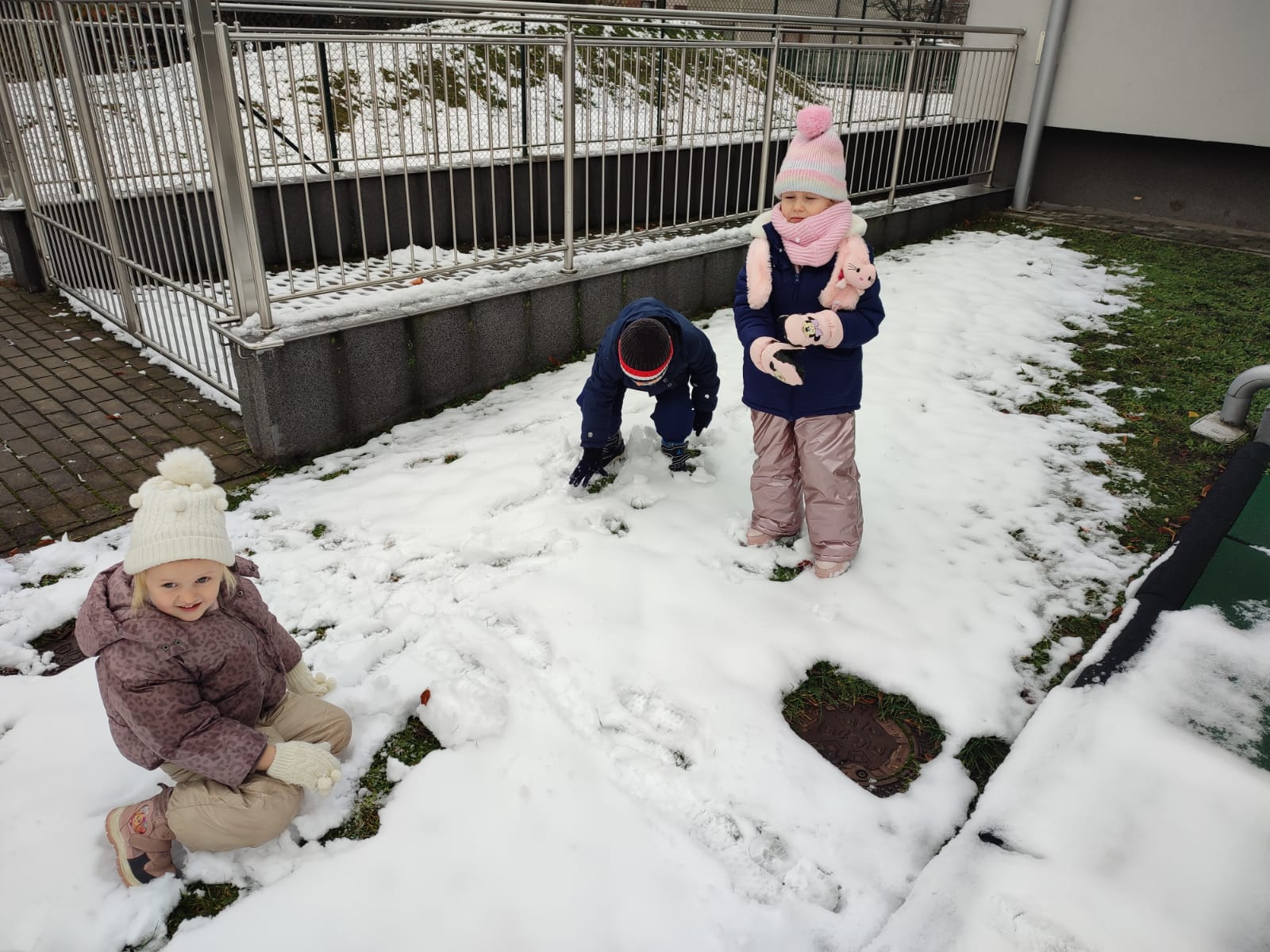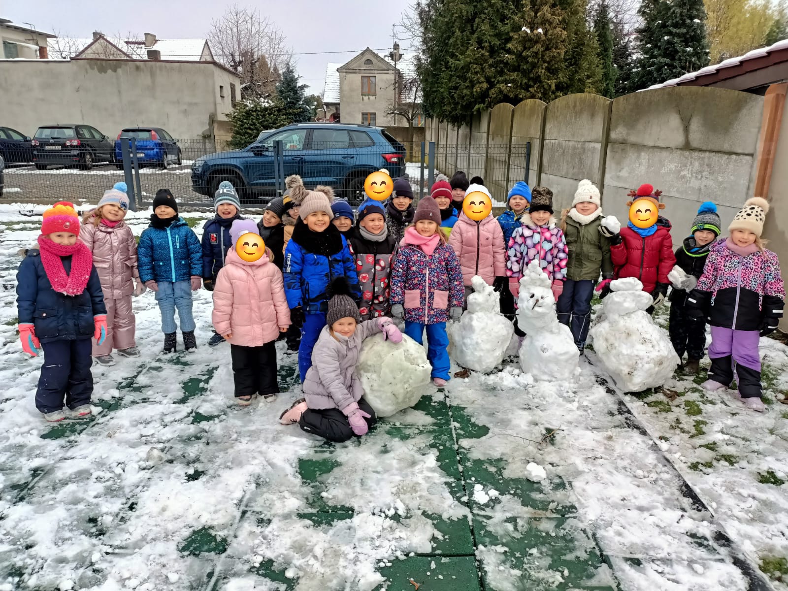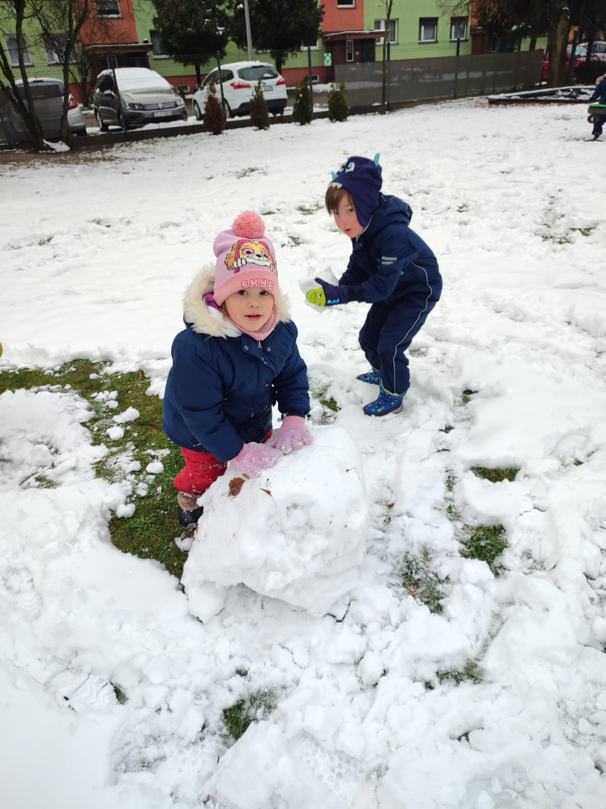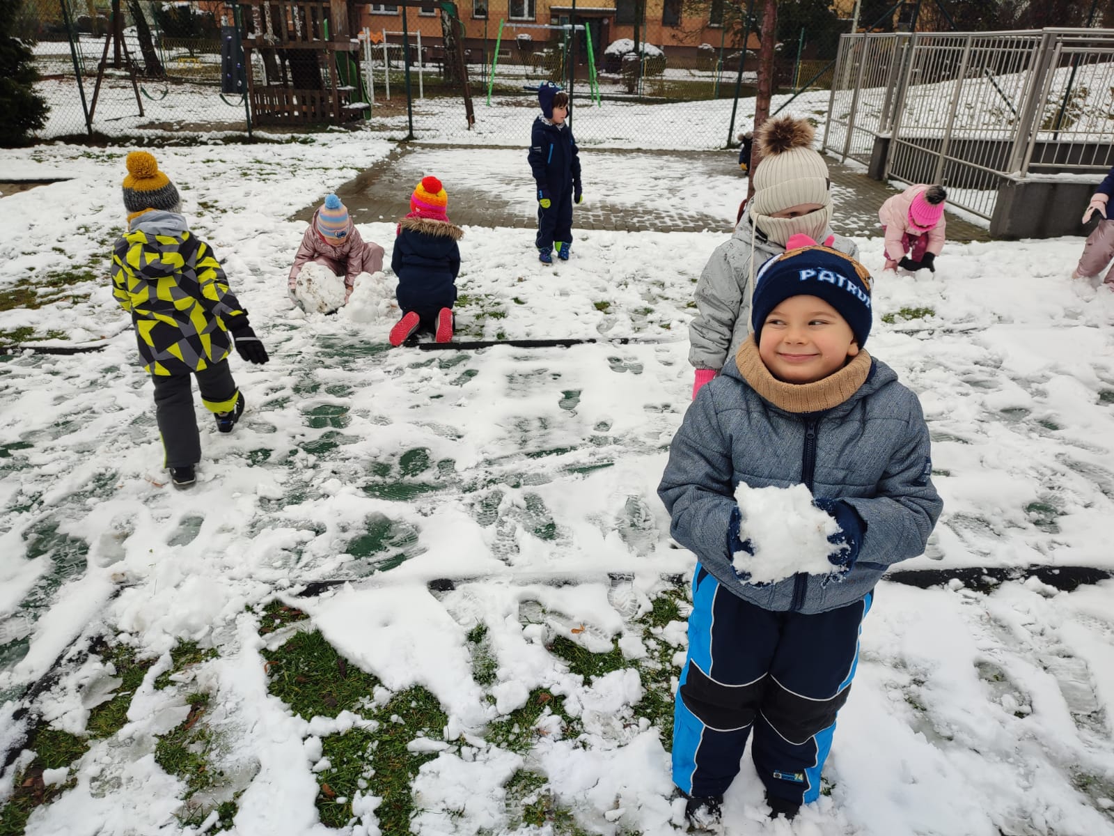 Dzieci z grup „Pszczółki” i „Słoneczka” z radością wyszły na przedszkolny plac zabaw, aby korzystać z uroków pierwszego śniegu. Maluchy z entuzjazmem biegały, lepiły małe bałwanki i obserwowały zimowe zmiany w otoczeniu. Pierwszy śnieg przyniósł im mnóstwo uśmiechu i świetnej zabawy na świeżym powietrzu.