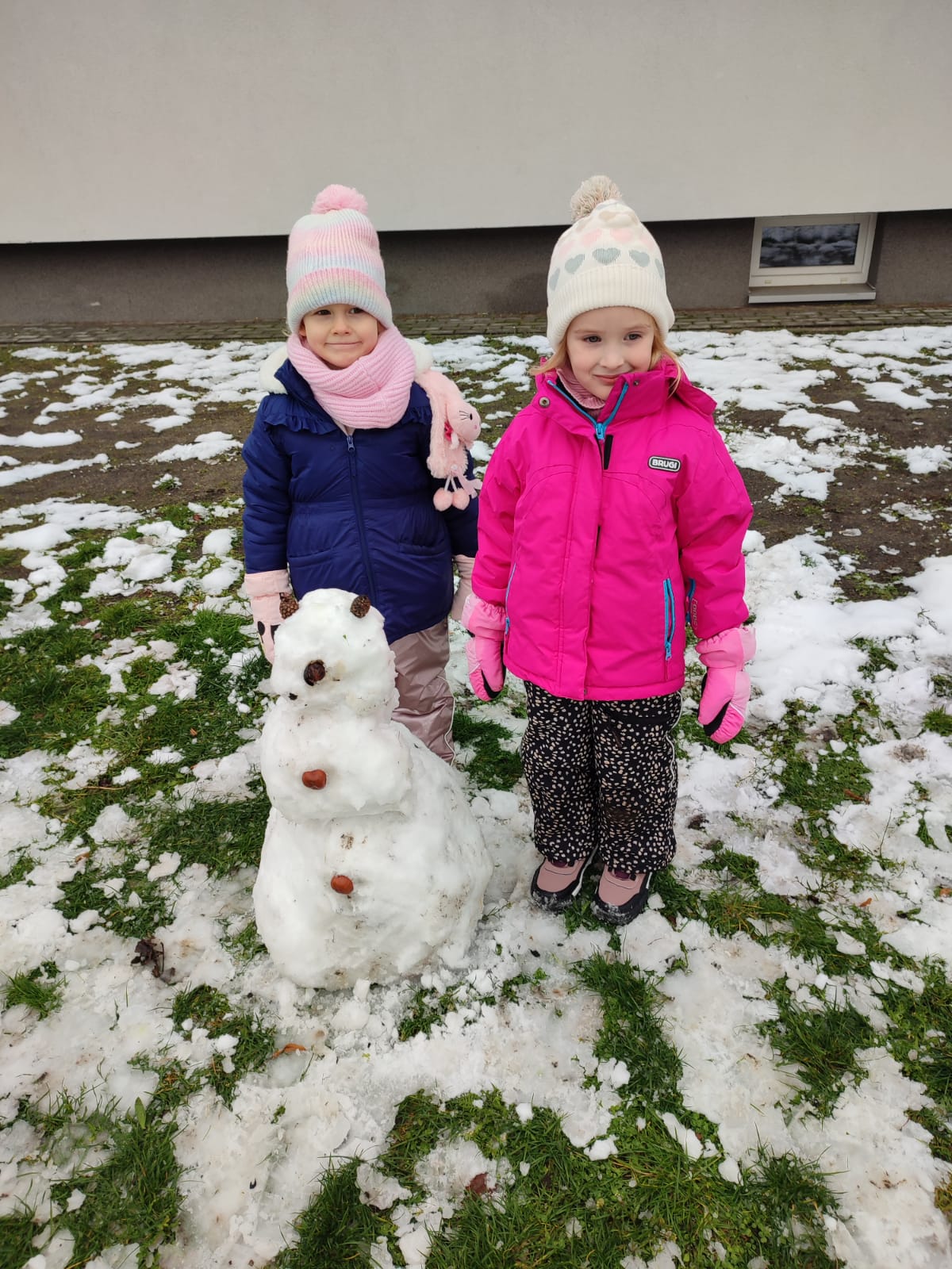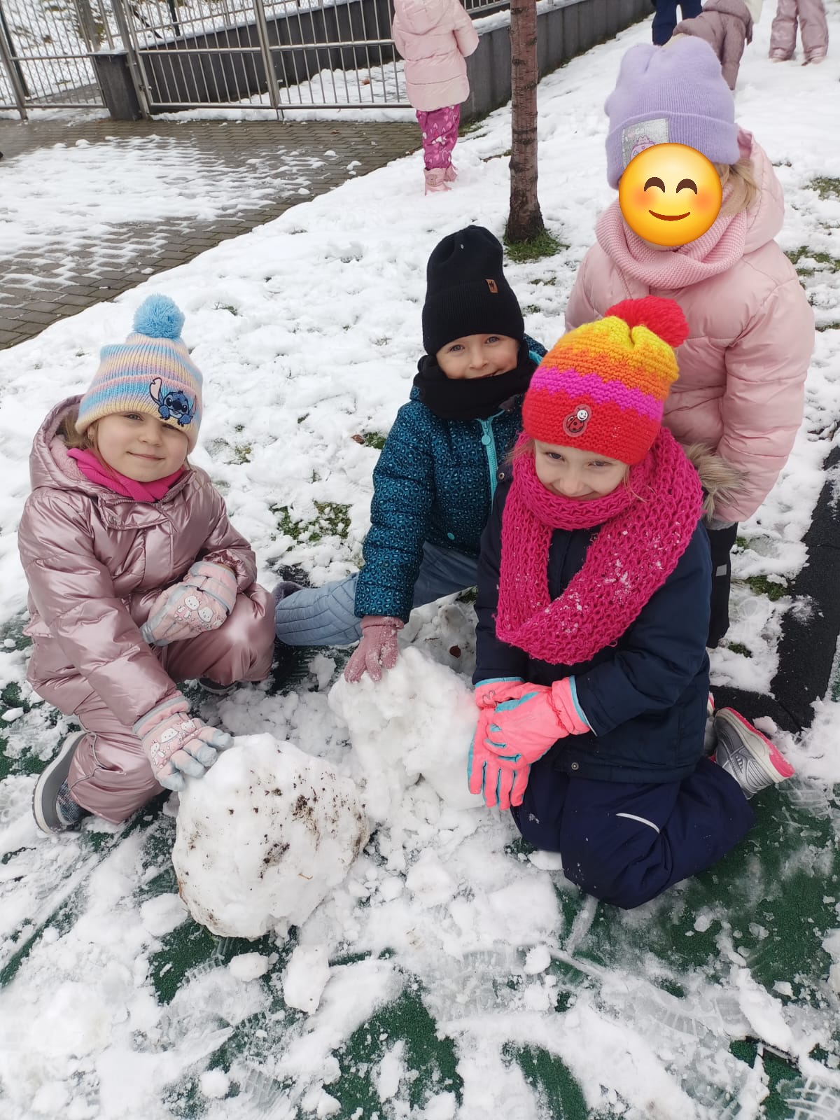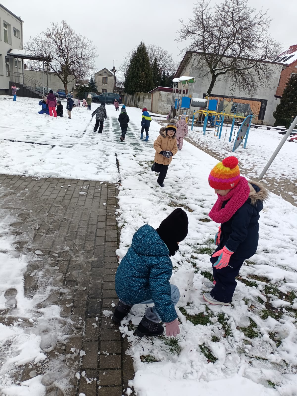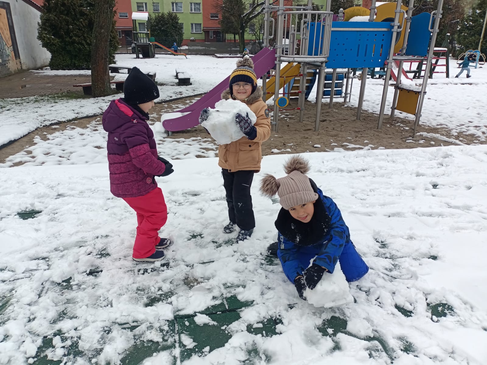 Dzieci z grup „Pszczółki” i „Słoneczka” z radością wyszły na przedszkolny plac zabaw, aby korzystać z uroków pierwszego śniegu. Maluchy z entuzjazmem biegały, lepiły małe bałwanki i obserwowały zimowe zmiany w otoczeniu. Pierwszy śnieg przyniósł im mnóstwo uśmiechu i świetnej zabawy na świeżym powietrzu.