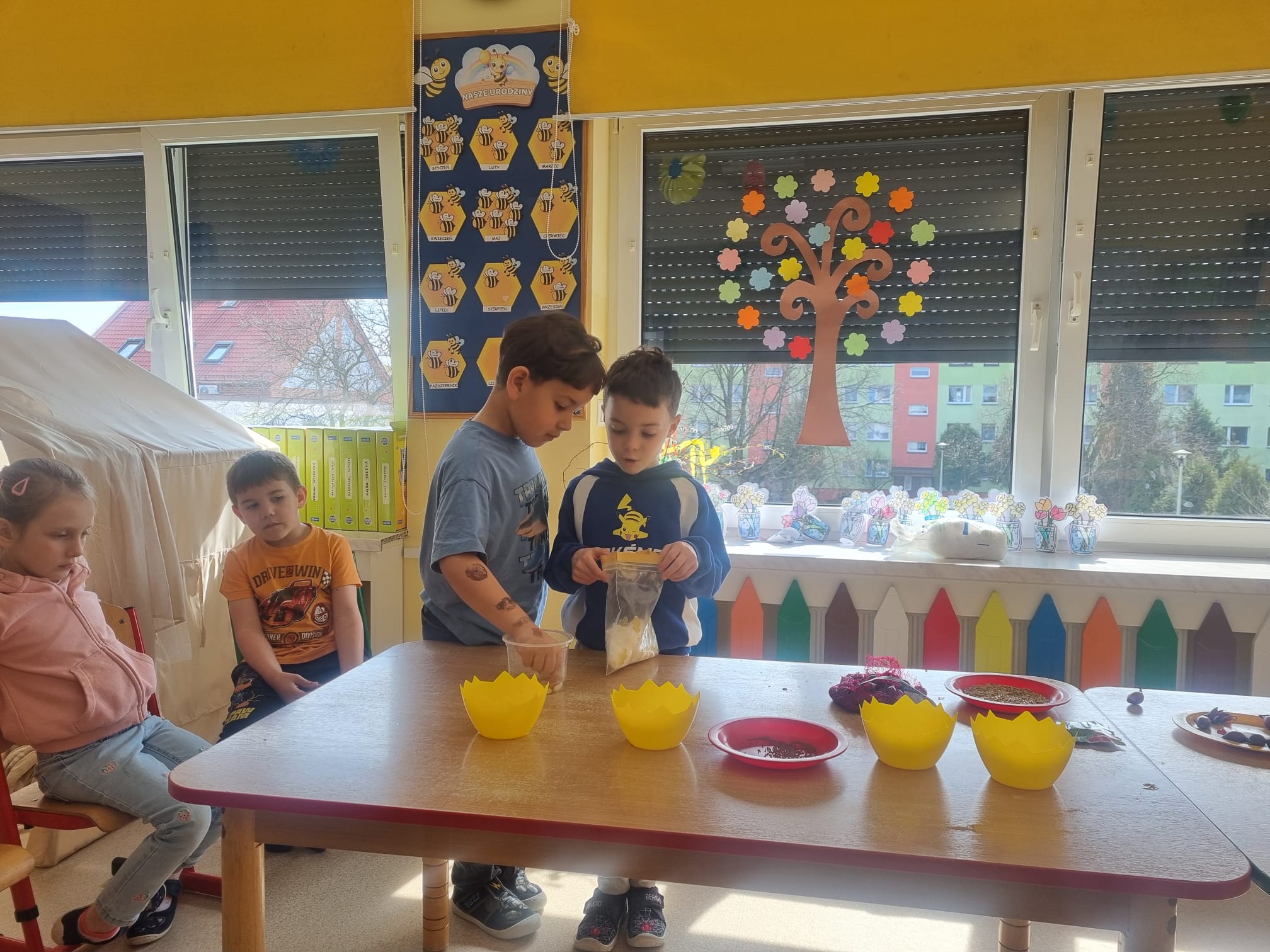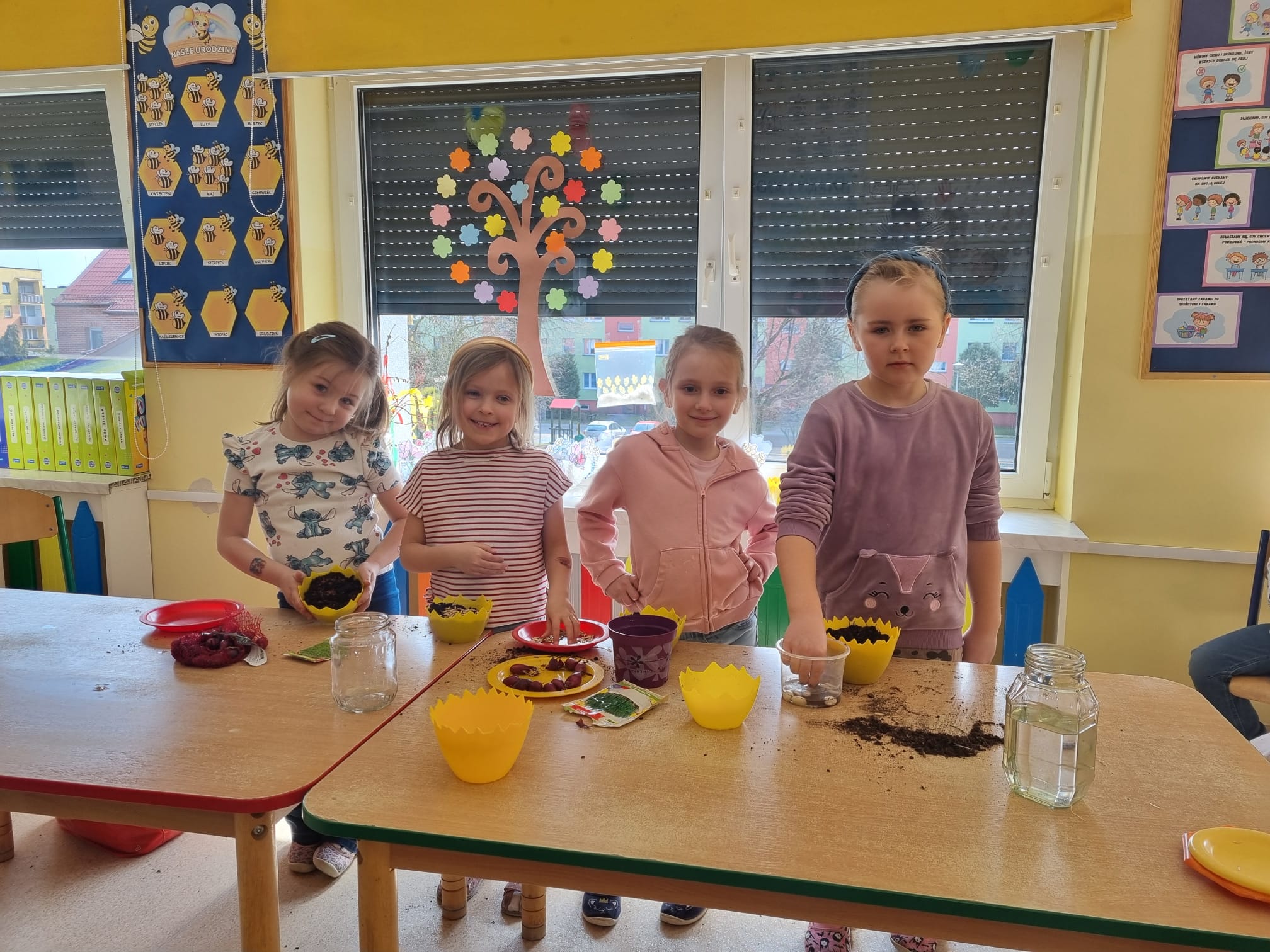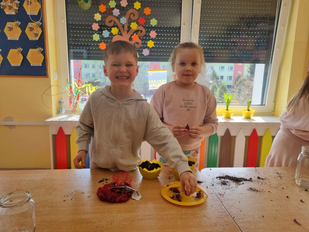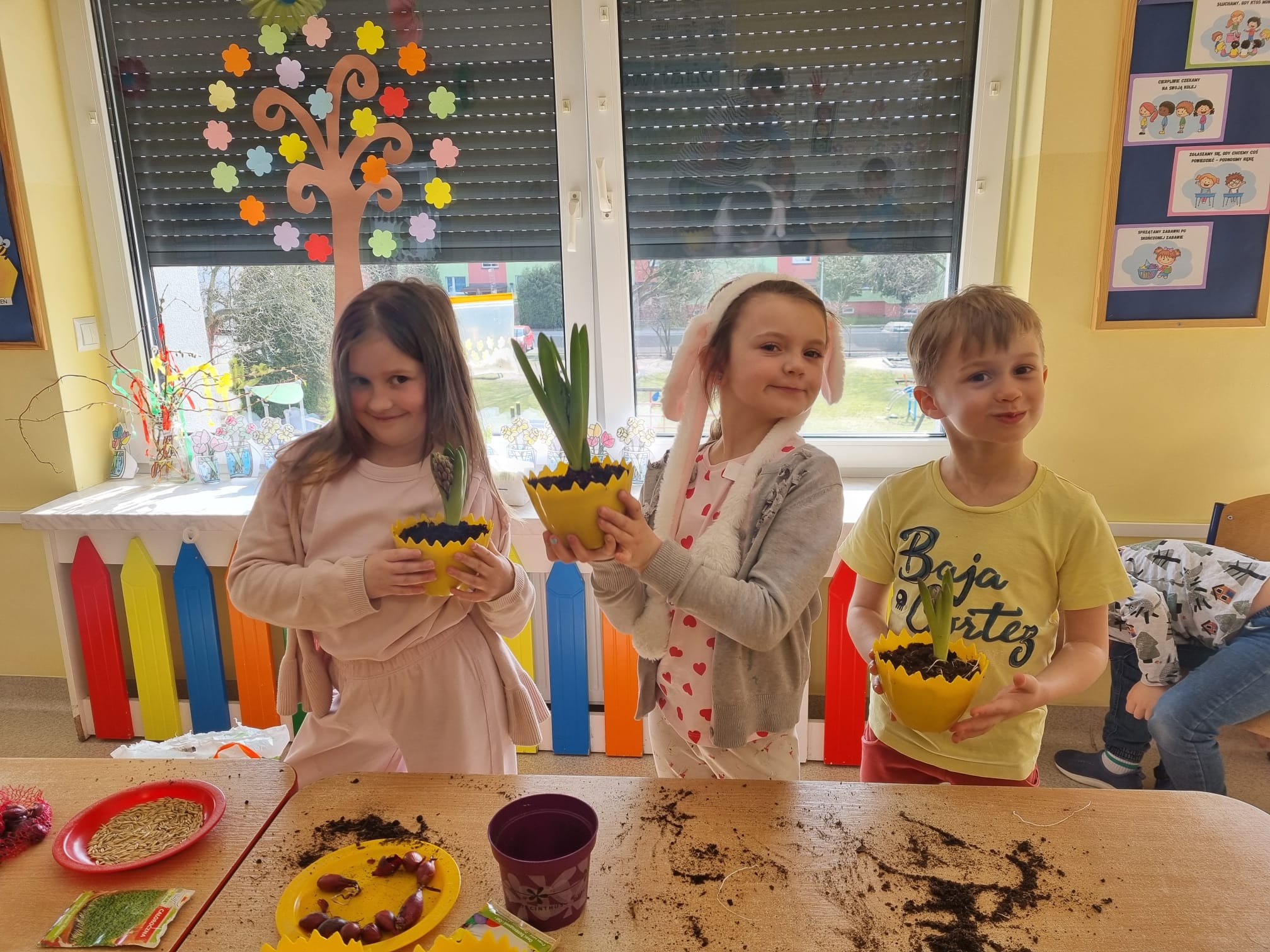 Ponadto dzieci podjęły działania mające na celu udekorowanie sali w związku z wiosną. Wspólnie przygotowano wiosenny parapet, na którym posadzono wiosenne kwiaty, rzeżuchę, owies oraz cebulkę dymkę. Obecnie dzieci obserwują wzrost roślin, ucząc się systematyczności i odpowiedzialności za ich pielęgnację.