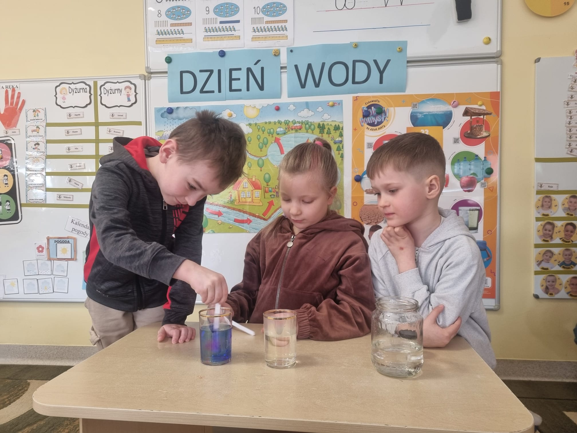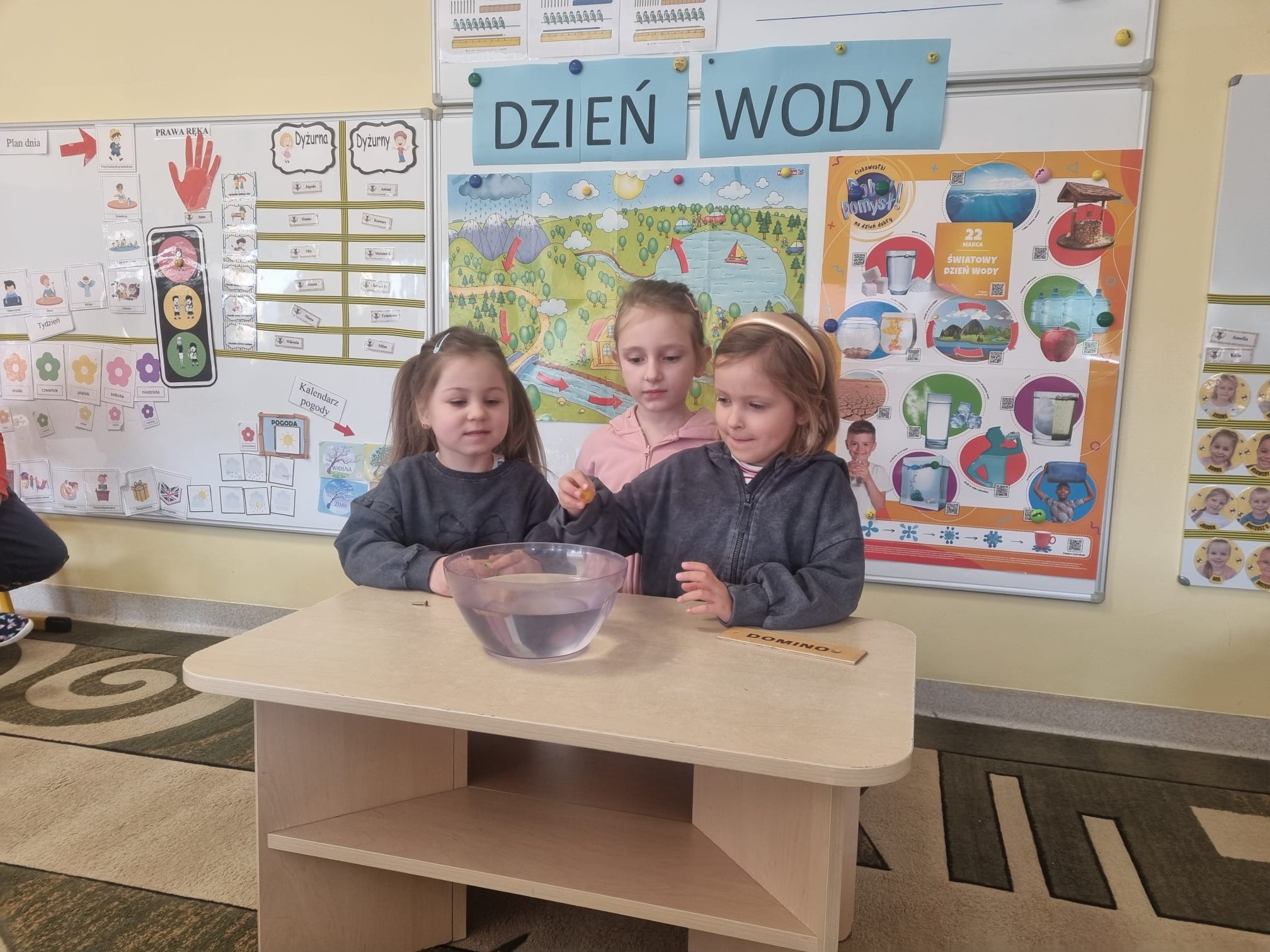 W bieżącym tygodniu w grupie „Pszczółki” obchodzono Światowy Dzień Wody. W ramach zajęć dzieci zapoznały się ze sposobami oszczędzania wody oraz z jej obiegiem w przyrodzie. Istotnym elementem aktywności były eksperymenty, dzięki którym przedszkolaki mogły poznać właściwości wody w sposób praktyczny i angażujący.